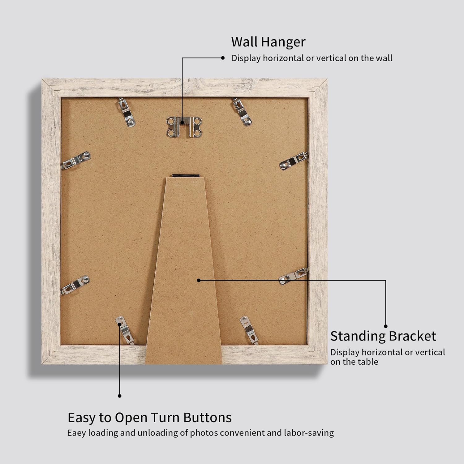 • Multi Frames Collage Set: Includes 4 frames in the same size. Perfectly fits 6x6 inch pictures with mat or 8x8 inch without mat. The frame opening display size is 0.5 inches smaller than the photo size for secure mounting.