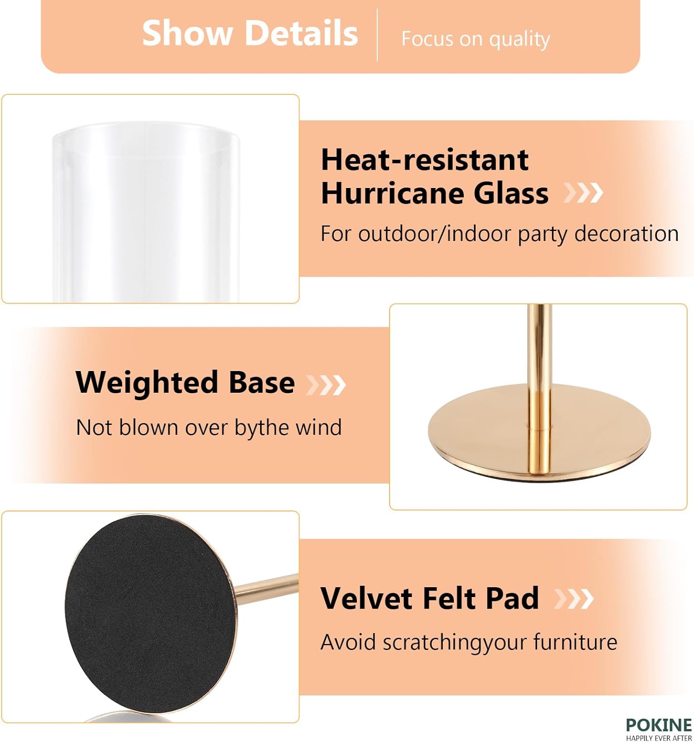 • Understated and Classic Glass Candlestick Holder: Chic gold candle holder matches well with removable thick hurricane cylinder.Different height candlesticks, The visual effect of the high and low undulating candlelight gives you a wonderful feeling.Add a more romantic atmosphere to your dates, parties, holiday celebrations and anniversaries.