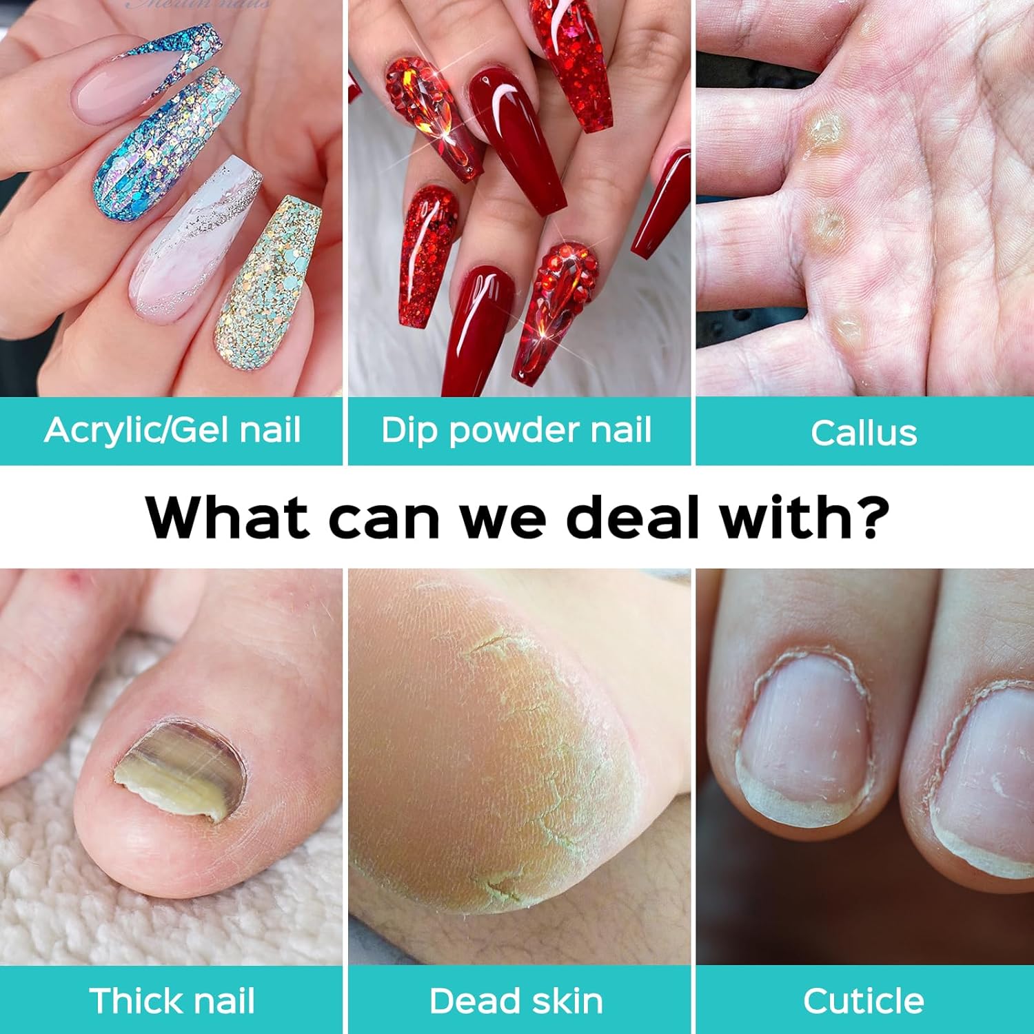 • Multifunctional Nail Drill Kit: With adjustable various speeds and 6 different nail drill bits, this electric nail file can polish or remove acrylic, gel, and dip powder nails, as well as tackle thick nails and cuticle dead skin