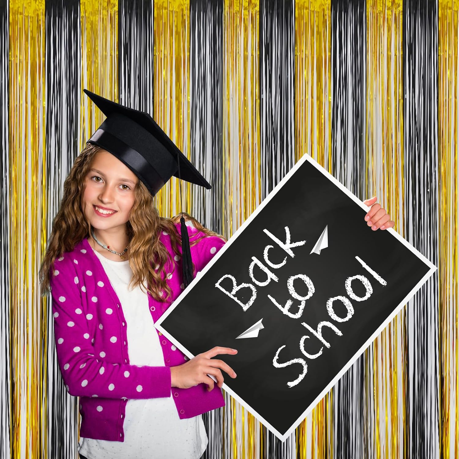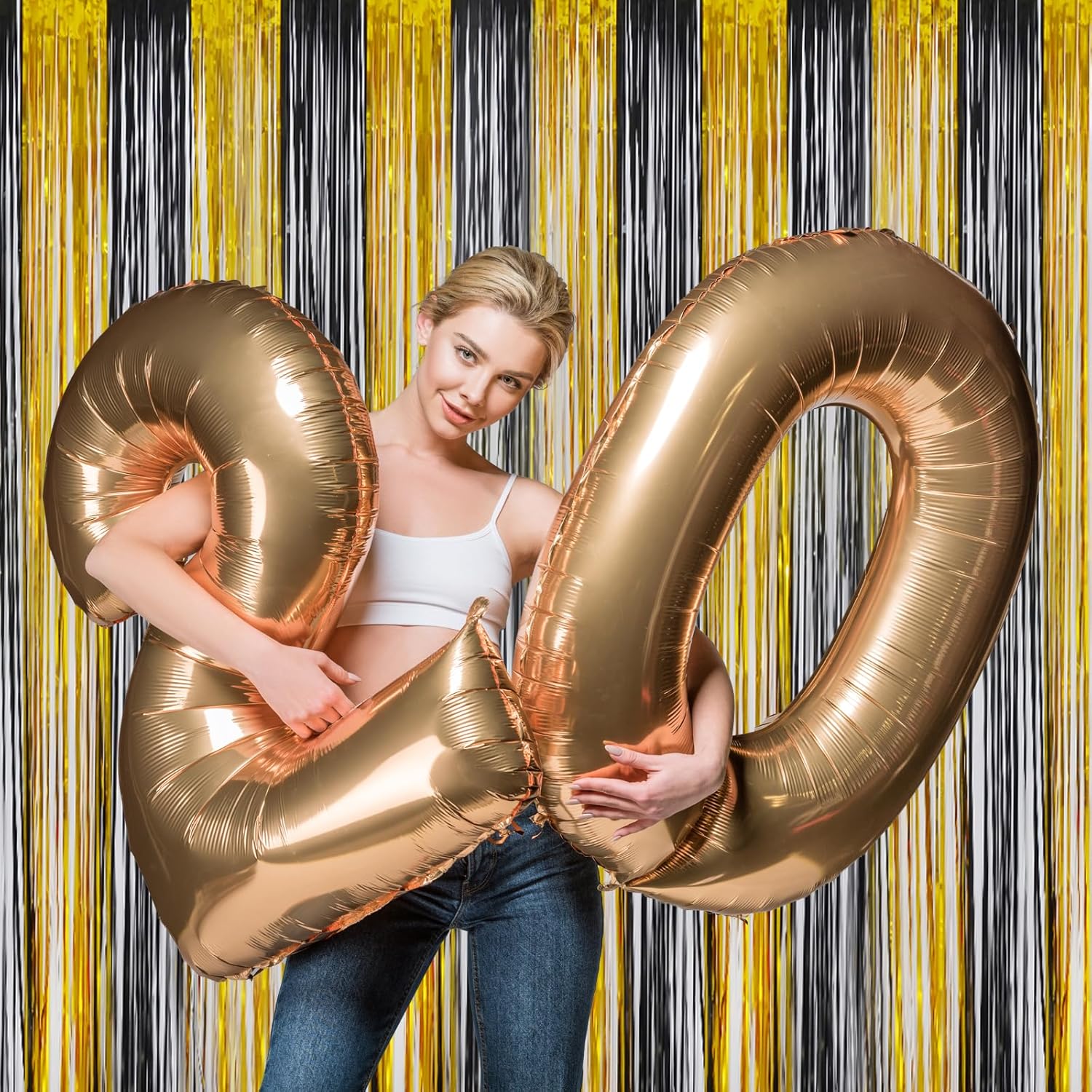 Melsan Foil Curtain Tinsel Backdrop - 3.2ft X 8ft Black and Gold Fringe Curtain Photo Streamers Backdrop for Halloween, Graduation, New Year EVE, Retirement Party Decorations - Pack of 2