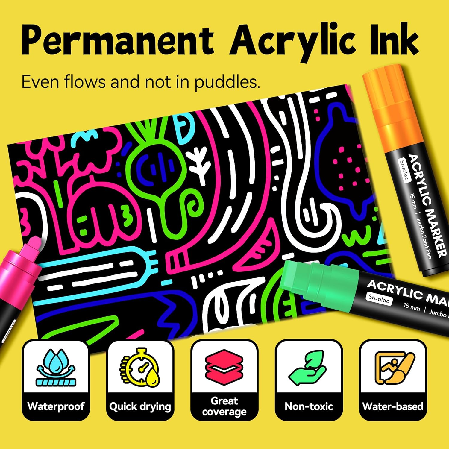 • Jumbo Markers Set: SRUOLOC jumbo markers are made with the highest quality water-based acrylic ink. That is waterproof, quick-drying, permanent , and smooth flow