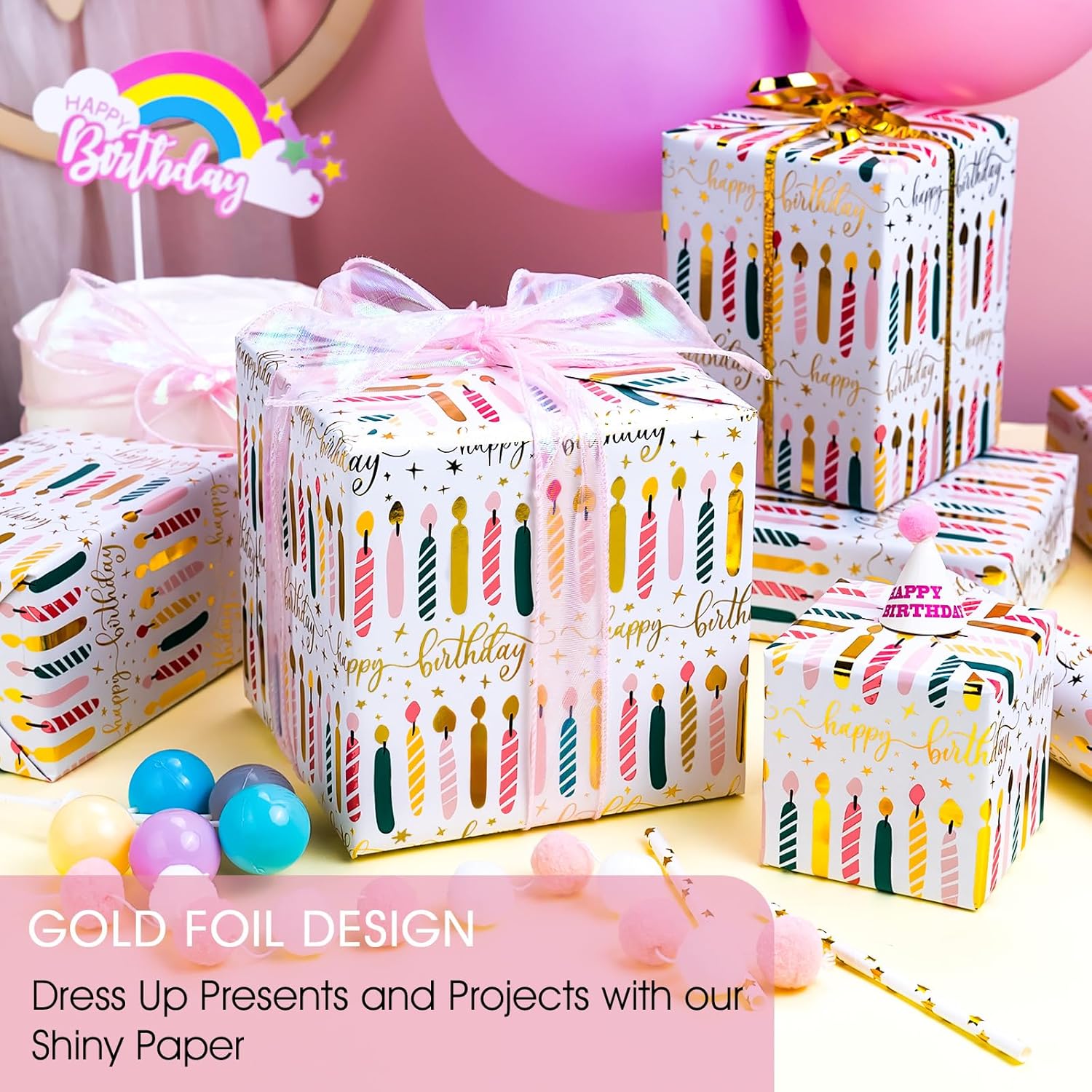 • Gold Birthday Candles Wrapping Paper: Featuring a vibrant design with shimmering gold foil birthday candles and joyful "Happy Birthday" lettering, Unveil the touch of elegance for any birthday celebration with our gold foil birthday wrapping paper