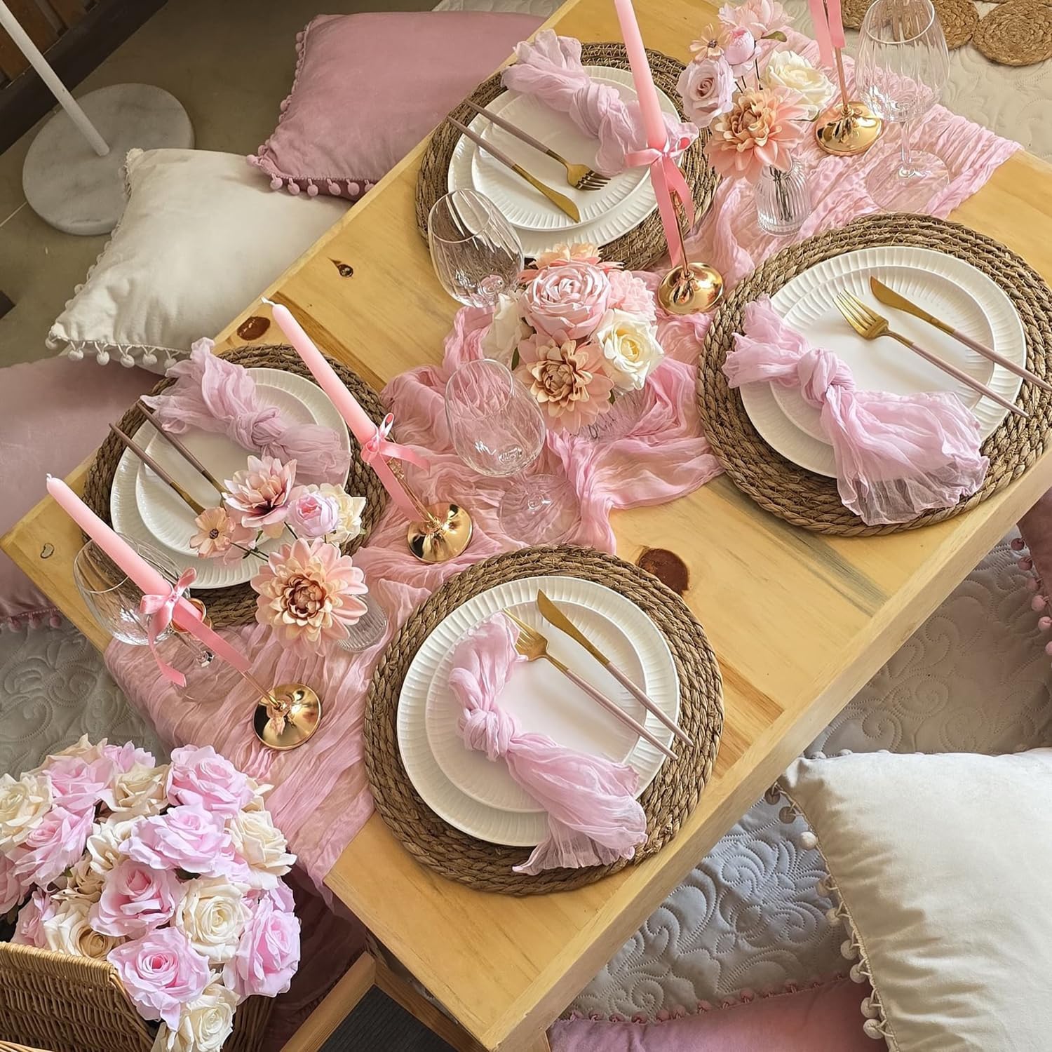• 🌸Romantic and Sweet Cheesecloth Table Runners: The baby pink table runners 10ft represents dreamy and romantic feelings. They are like fairy tale elves that bring incredible and enchanting visions to life. Giving a table runner pink to yourself or someone else can convey the romantic and dreamy atmosphere, and feel the sweetness of love and happiness, especially matching with wedding, baby shower, party,girl theme or other modern themes. You also can tie a bow to make the wedding table runner look more special.