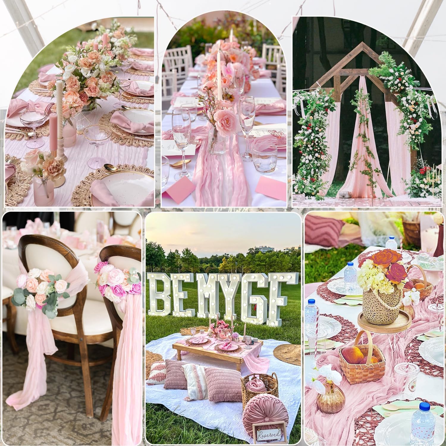 • 🌸Widely Occasion: Our light pink cheesecloth table runner looks nice on various occasions, Such as weddings, parties, graduation parties, wedding receptions, wedding showers, rustic themed parties, dinner events, wedding arches, rooms, hobo decorations, receptions, valentine's day, thanksgiving, christmas, dessert tables, western elegance themes, fundraisers, backdrops, wedding guest tables, celebrations of life, fenced and mirrored corners, stumps or vase decorations and other special occasions. The pretty table runner well decorates wedding, parties, home, hotel,grand estates and gardens and more, that makes your life chic.