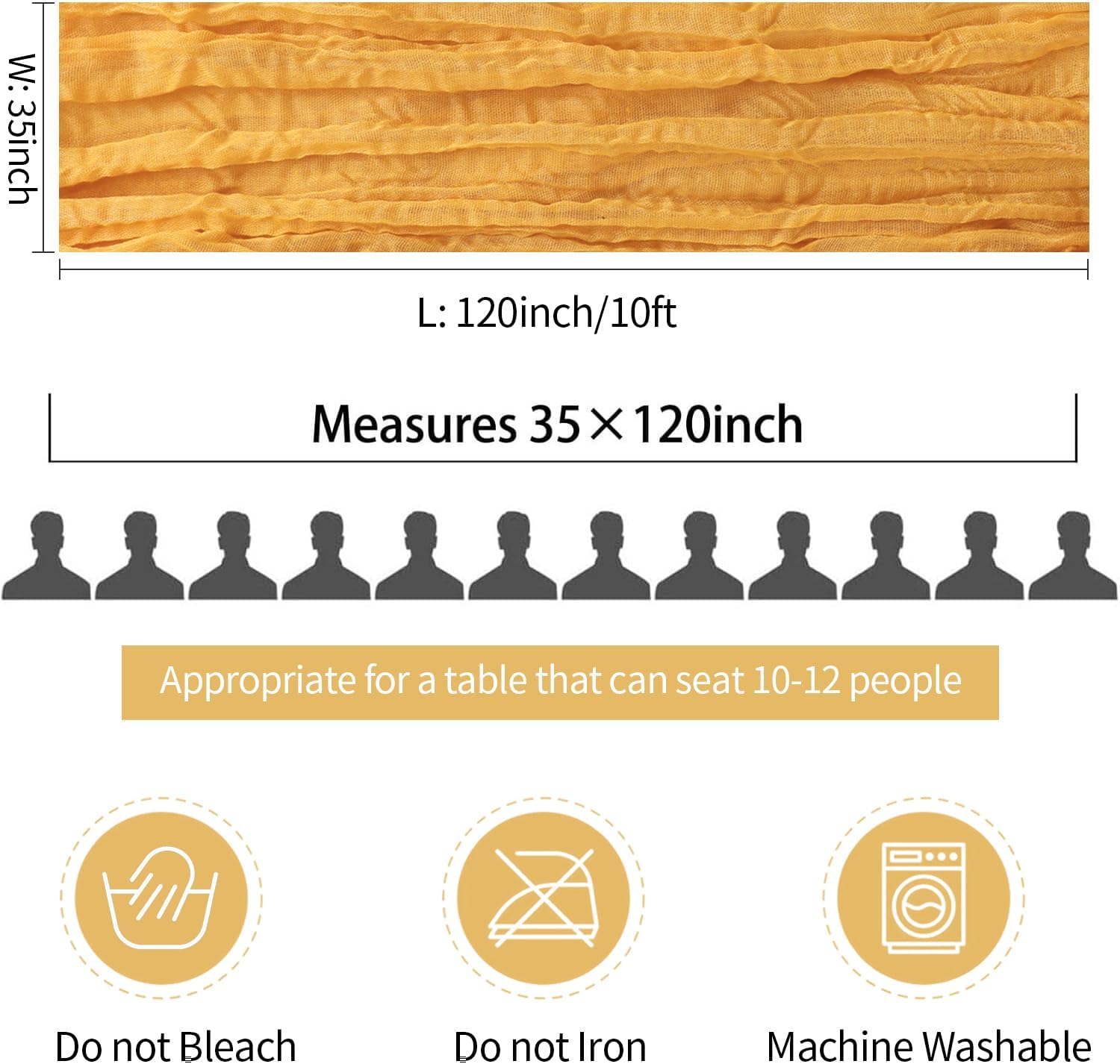 • 🌻3 Pack Mustard Yellow Cheesecloth Table Runner: You will get 3 pieces 10ft length gold cheesecloth table runner, enough quantity is suitable for wedding banquets, baby shower, various parties or other event, the size of each table runner is approximately 35 x 120 inches / 90 x 305 cm, which is large enough to cover rectangle and round tables, can also be spliced together for long tables. Even can be used for chair cover sashes or decorative napkins, backdrop draping or even gift wrapping or mostly anything. Easy way to add texture to table decor and you can stretch and smooth them out as much as you'd like.