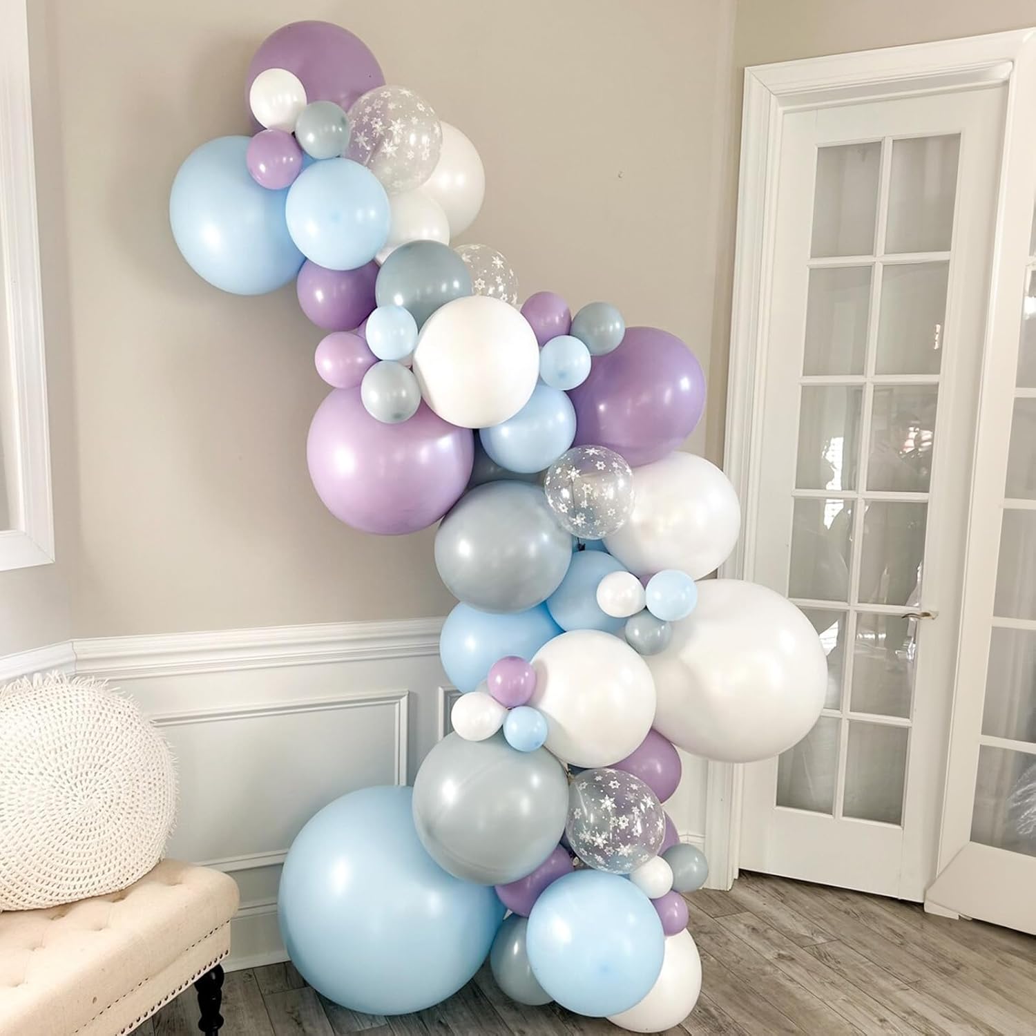 • Snowflake Balloons: You will get 5 different colors of 12 inch balloons, dusty purple balloons 20 pcs, dusty blue balloons 20 pcs, metallic dark peacock blue balloons 10 pcs, snowflake clear balloons 5 pcs, silver confetti 5pcs, total 60 pieces, with 1pc balloon ribbon.