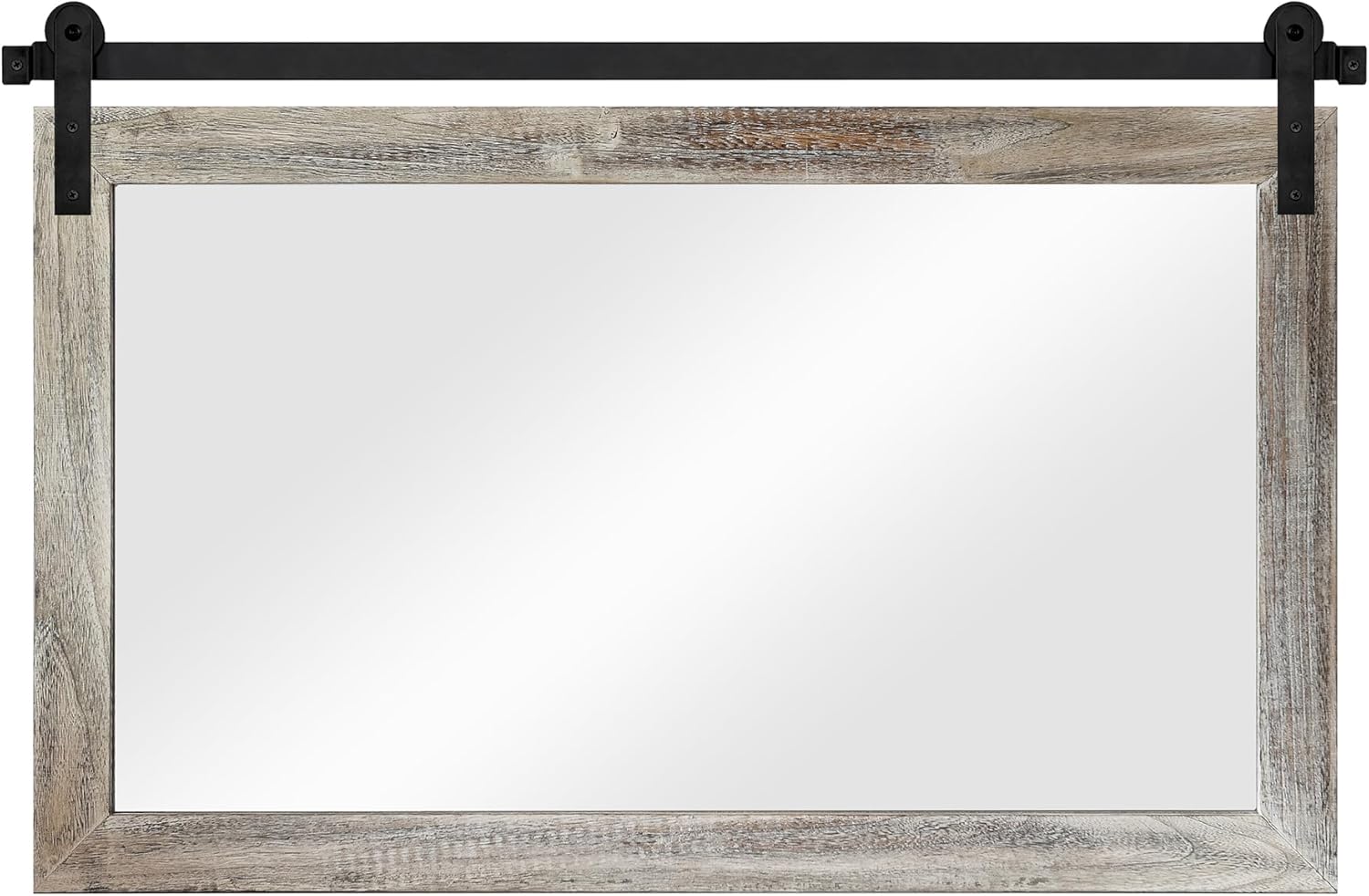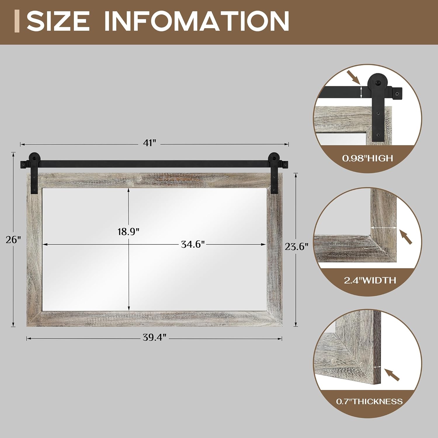 • EASY TO INSTALL: The overall size of this rustic mirror is 40.9 x 26 x 0.67 inch, and the display size of the mirror is 34.6 x 18.9 inch. The track is 41 inch. You can fix the pulleys to the mirror first, then mount the track on the wall and finally snap the pulleys onto the track to complete the hanging