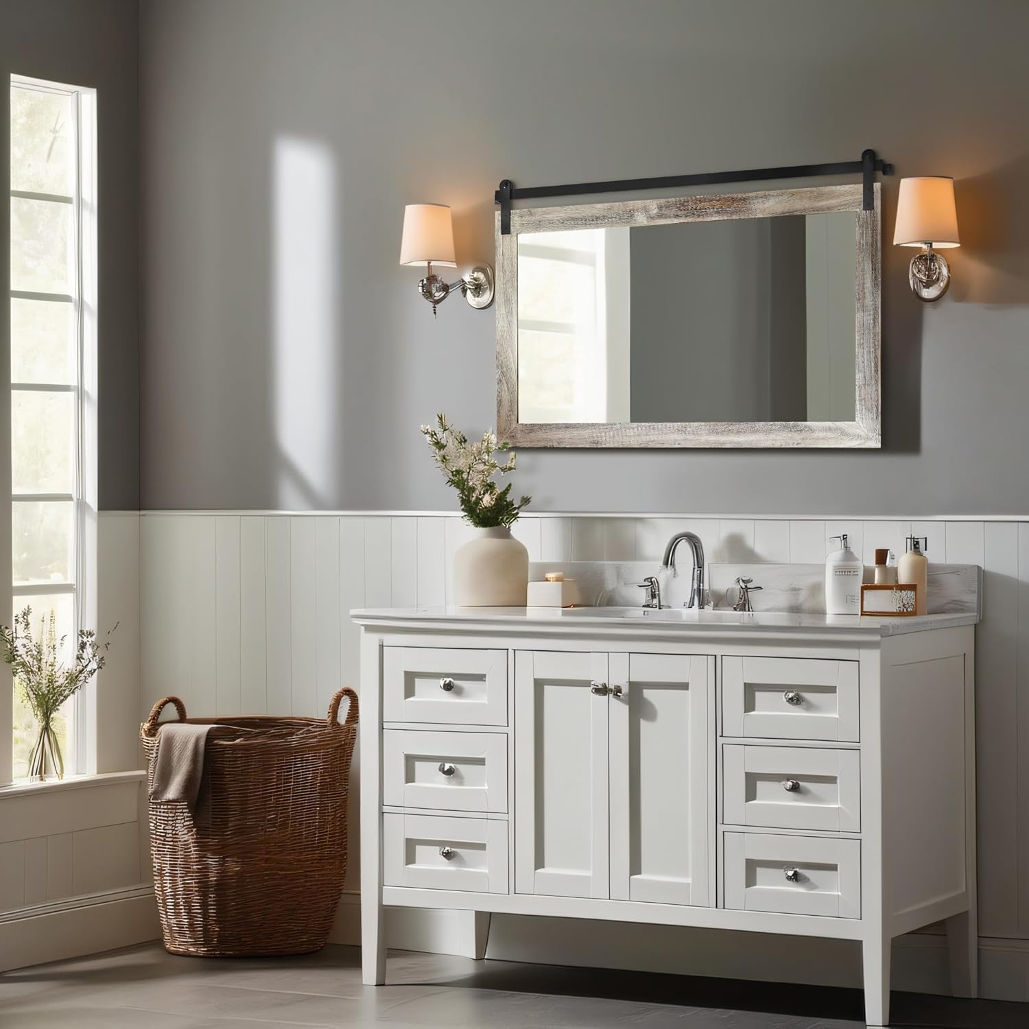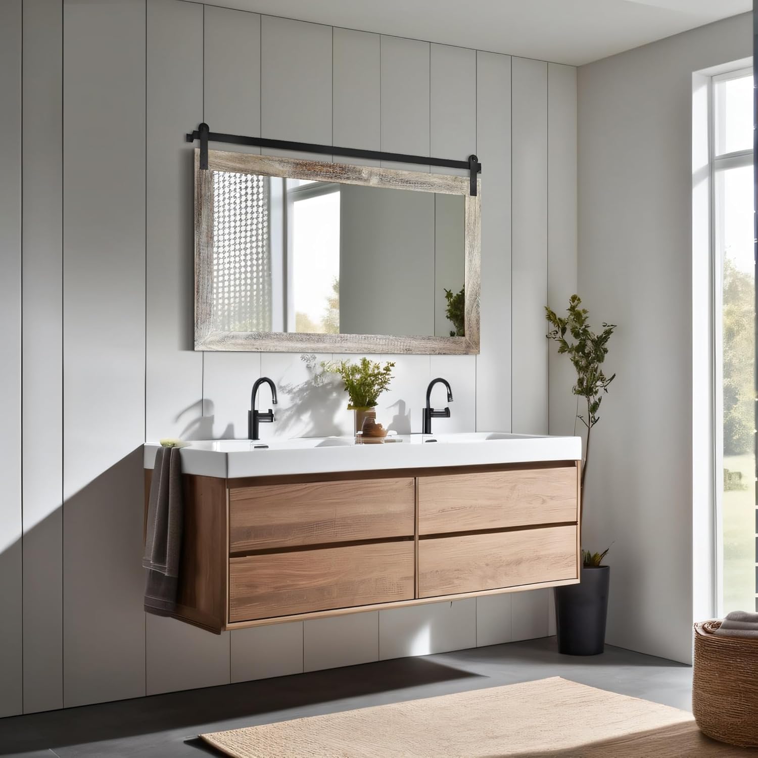 • VINTAGE DESIGN: This farmhouse mirror was inspired by a barn door and designed. It is a perfect combination of rustic and industrial style, which can make your home warm and inviting with the atmosphere of a farmhouse