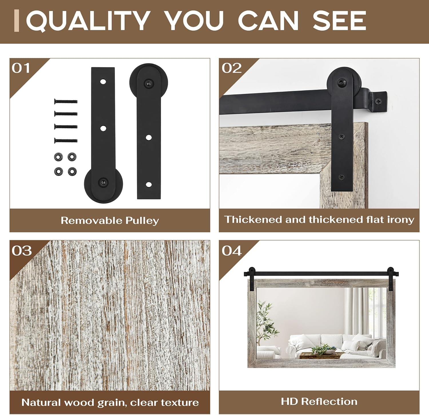 • QUALITY MATERIALS: The frame of the barn door mirror consists of an antique solid wood frame and a sturdy metal bracket. The interior features a 4mm HD silver mirror with clear and distortion-free reflections, providing a better sense of light and projection in your space