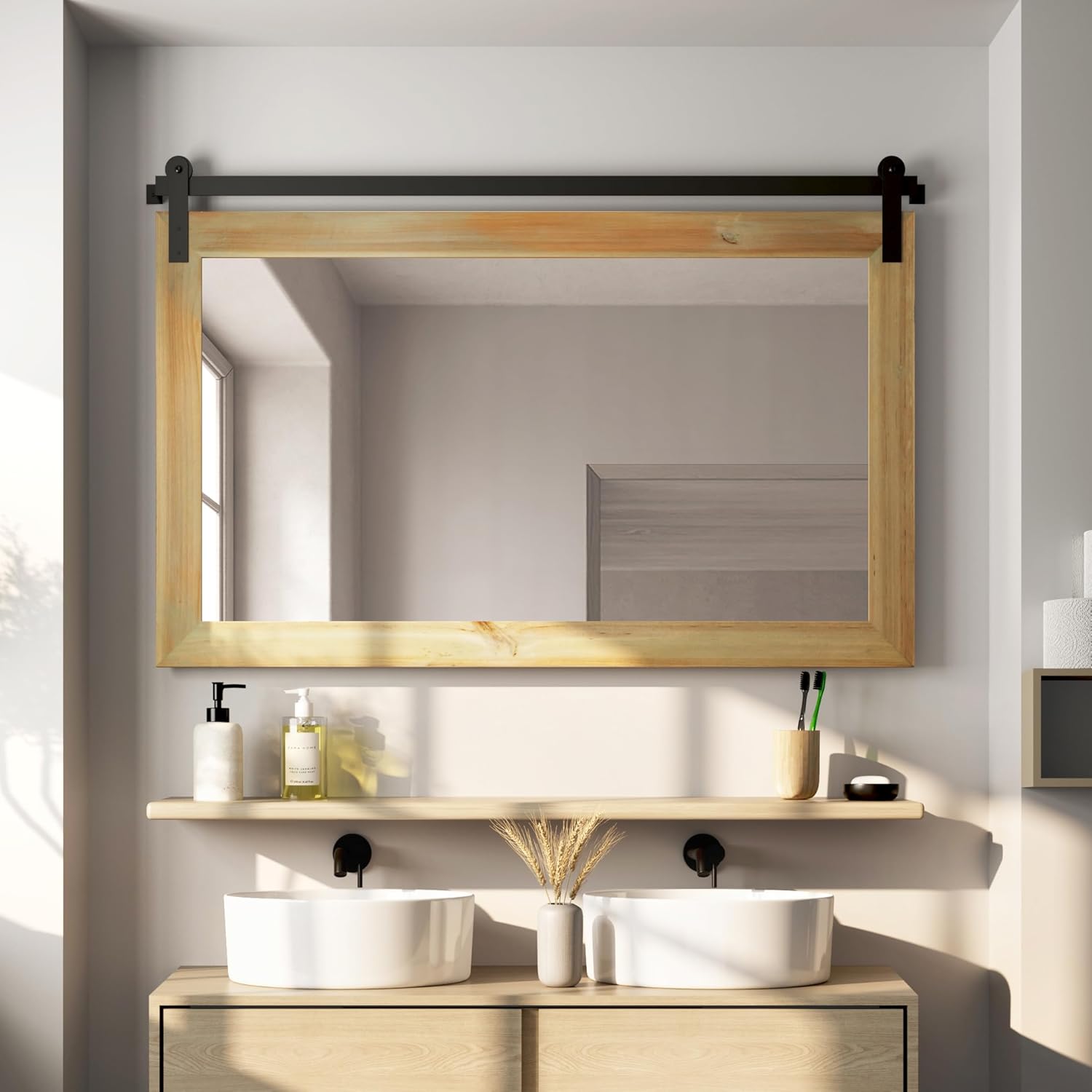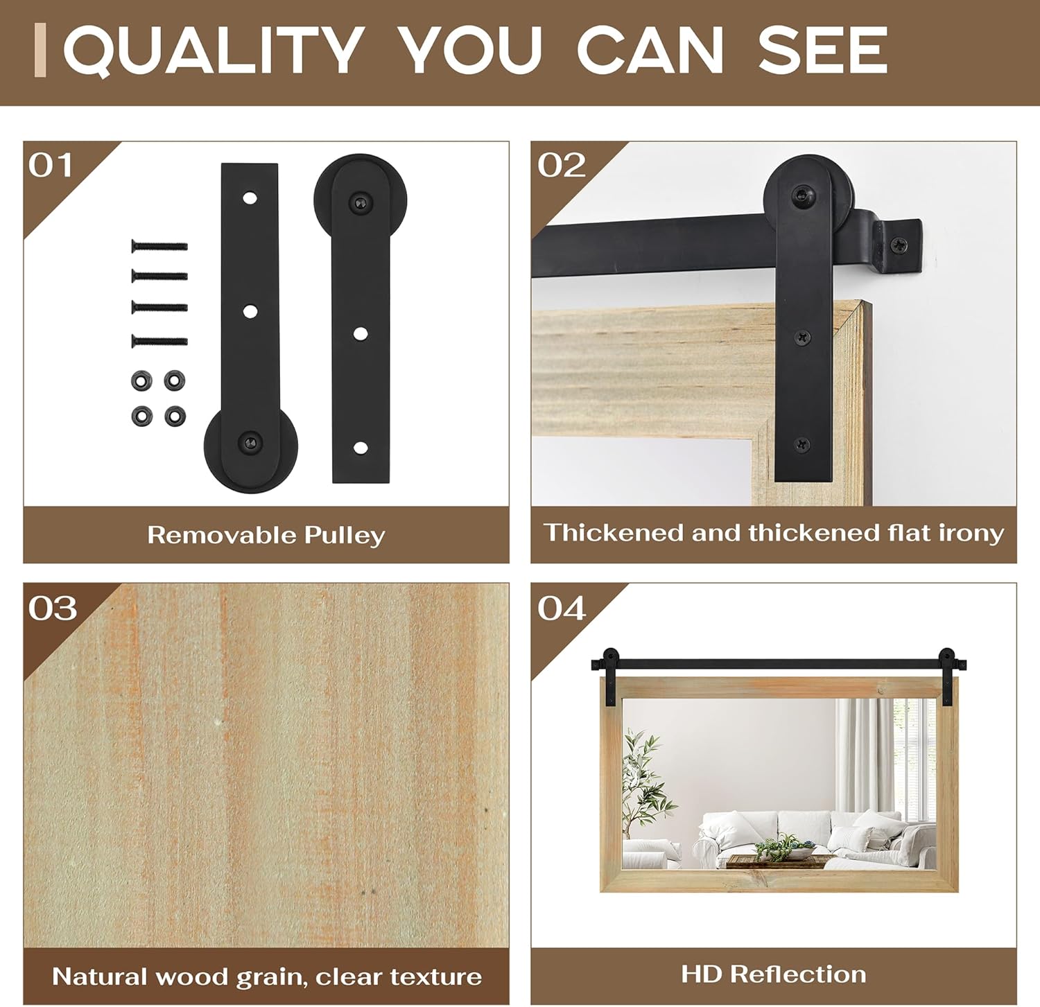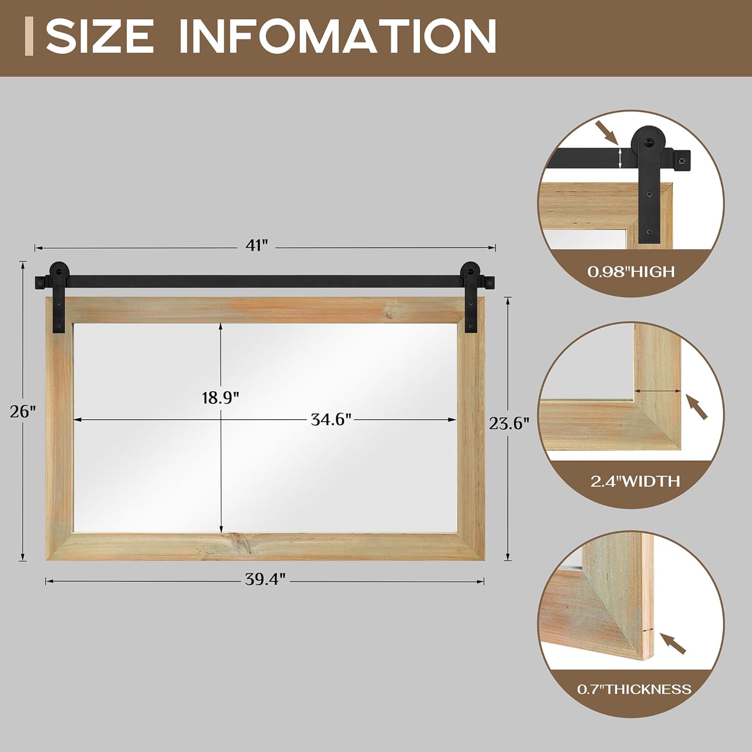 • EASY TO INSTALL: The overall size of this rustic mirror is 40.9 x 26 x 0.67 inch, and the display size of the mirror is 34.6 x 18.9 inch. The track is 41 inch. You can fix the pulleys to the mirror first, then mount the track on the wall and finally snap the pulleys onto the track to complete the hanging