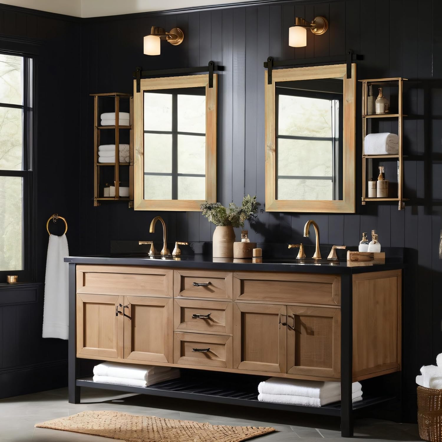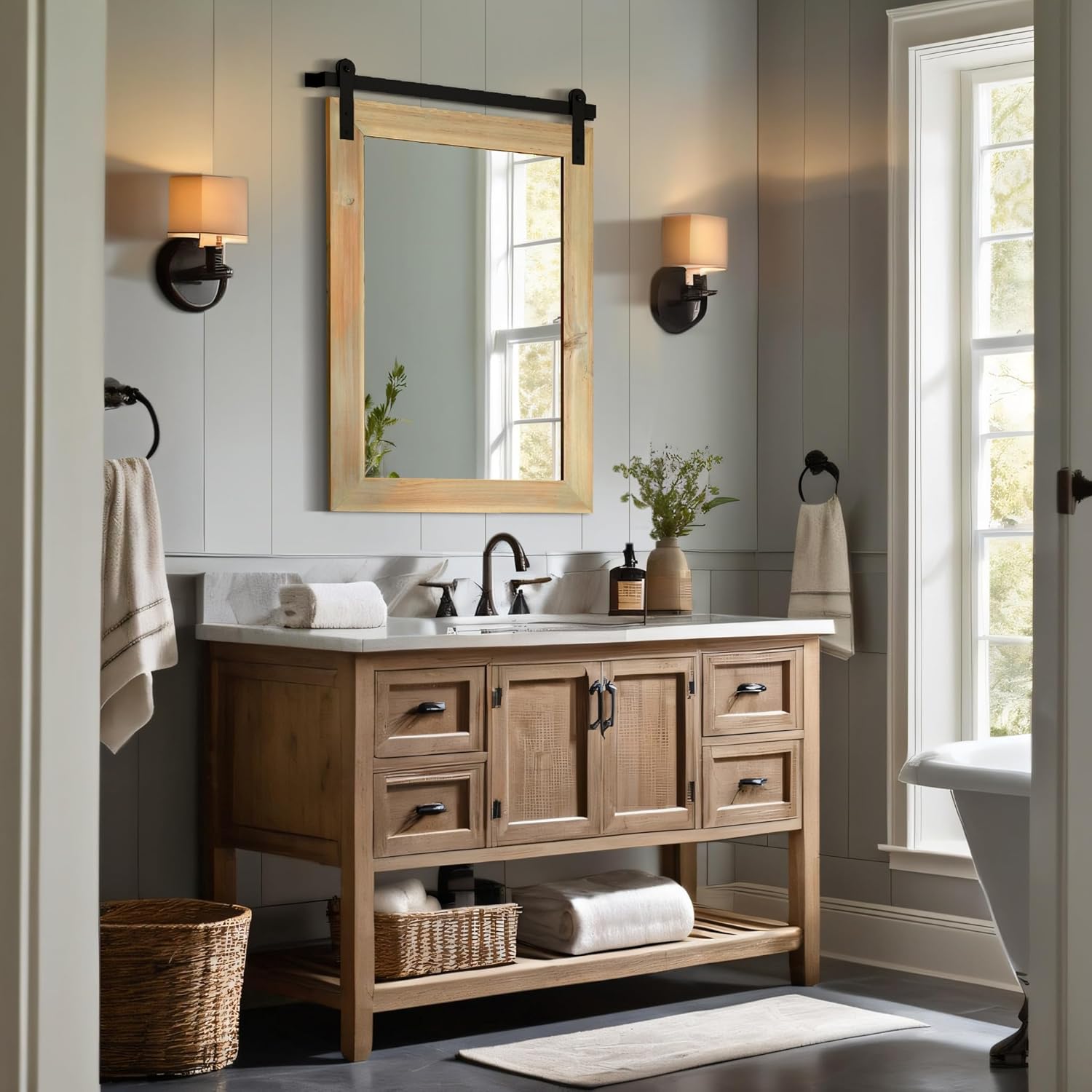 • VINTAGE DESIGN: This farmhouse mirror was inspired by a barn door and designed. It is a perfect combination of rustic and industrial style, which can make your home warm and inviting with the atmosphere of a farmhouse