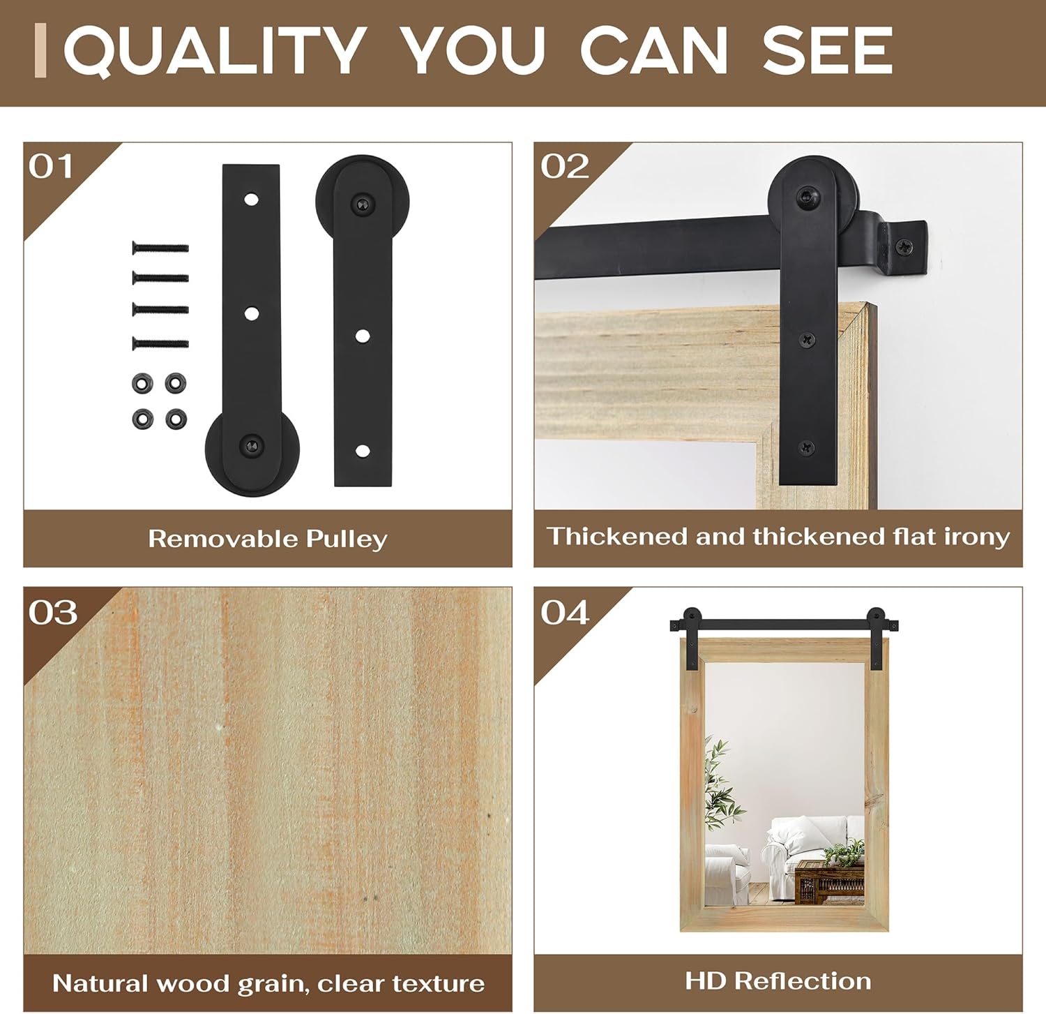 • QUALITY MATERIALS: The frame of the barn door mirror consists of an antique solid wood frame and a sturdy metal bracket. The interior features a 4mm HD silver mirror with clear and distortion-free reflections, providing a better sense of light and projection in your space