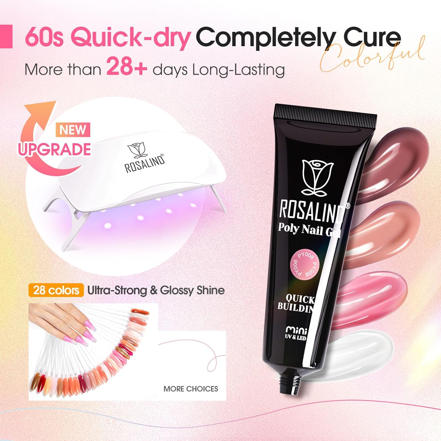 ROSALIND Poly Nail Gel Kit for Beginners - 28 Colors Extension Gel Set with UV/LED Nail Lamp, 72 Accessories (Base/Top Coat, Nail Forms, Tools), Long Lasting Salon Kit for DIY Manicure
