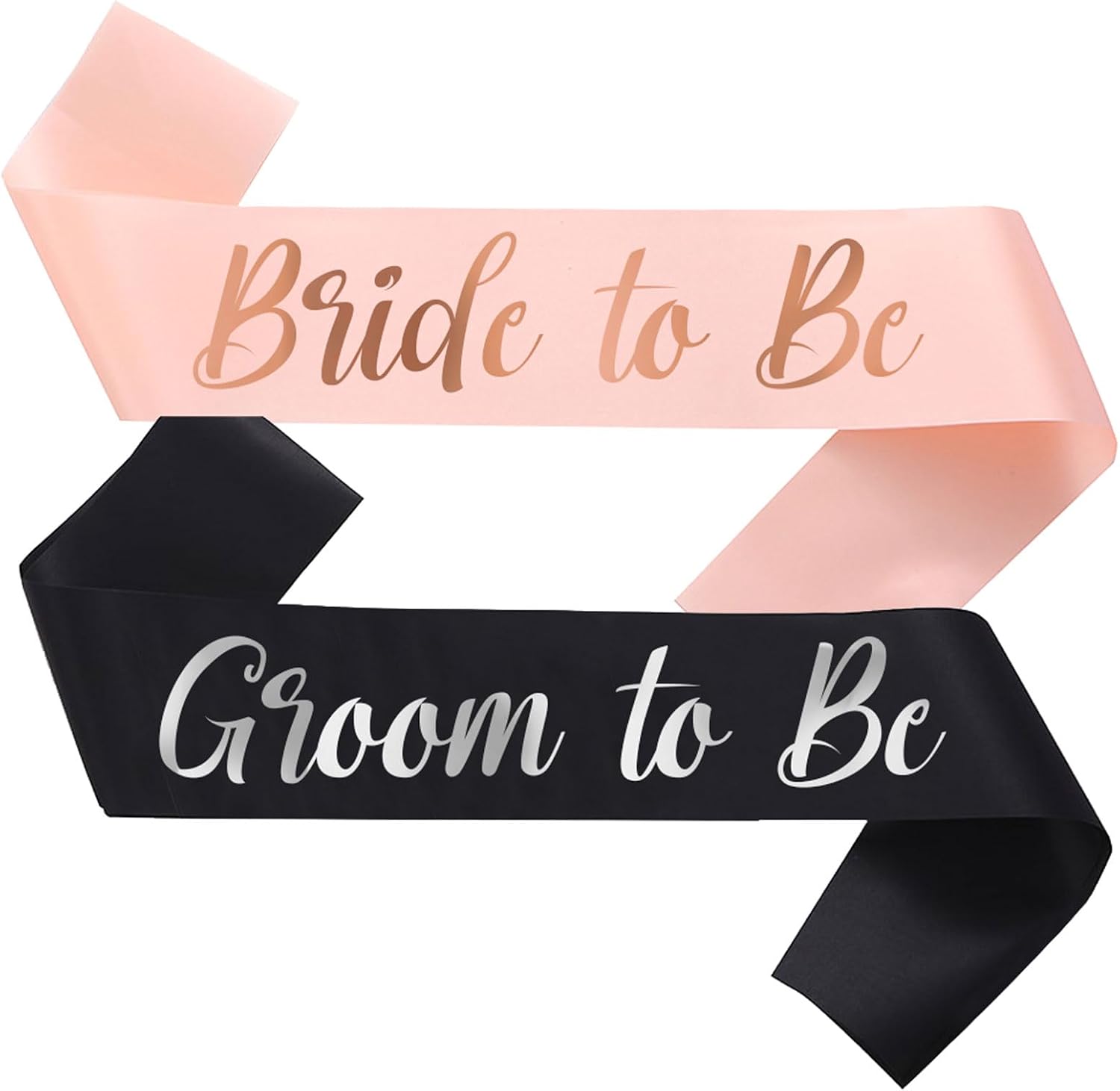 • Packag Includes: Each bridal shower sash comes with 1 piece of Bride to be sash in rose gold +1 piece of Groom to be sash in black +2 individual pins for fixing.