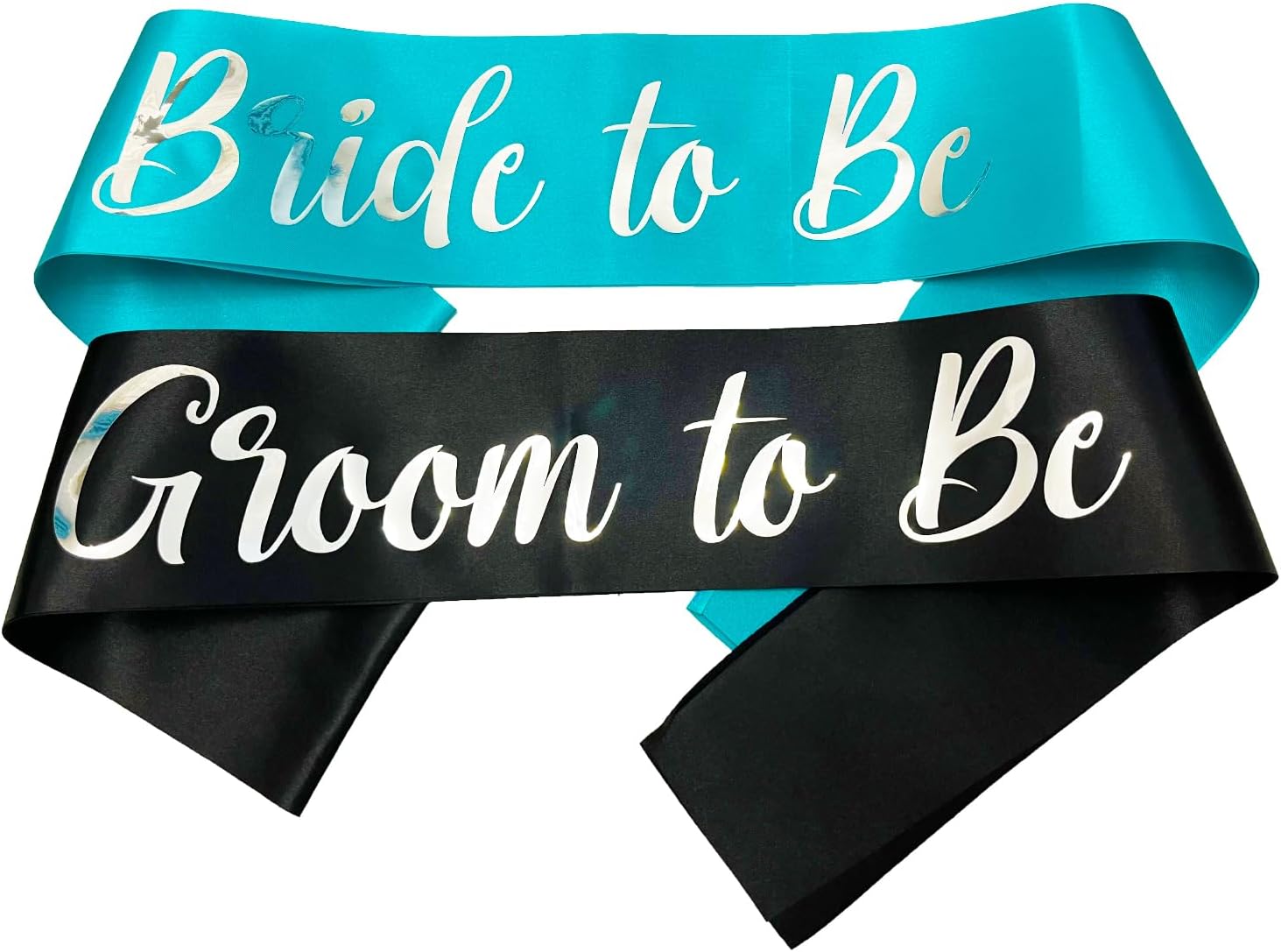 • Packag Includes: Each bridal shower sash comes with 1 piece of Bride to be sash in blue +1 piece of Groom to be sash in black +2 individual pins for fixing.