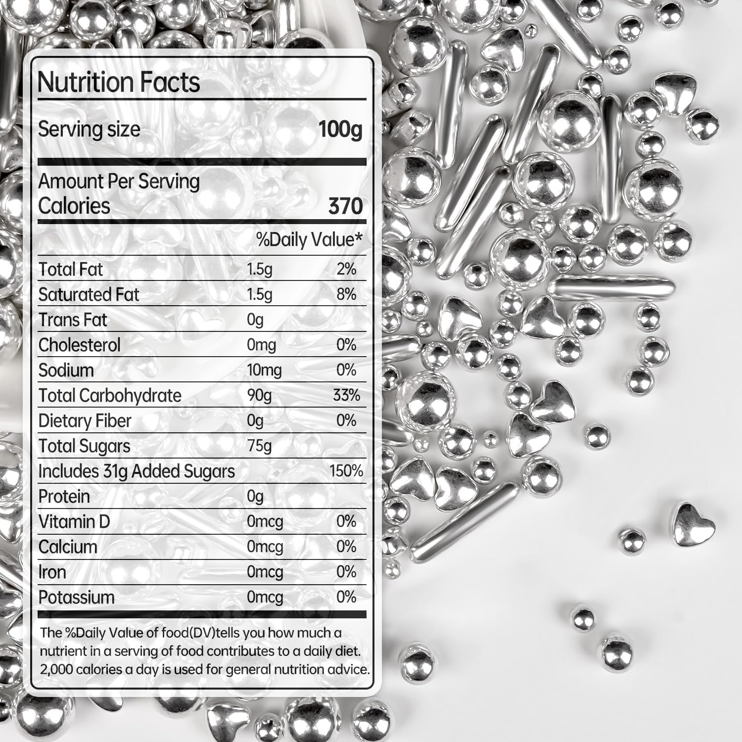 • Silver Pearl Rods Heart Sprinkles are a delightful addition to your baking and decorating collection. Net Weight: 150g/5.29oz. They are free of gluten, nuts, preservatives, dairy products, and any harmful chemicals.