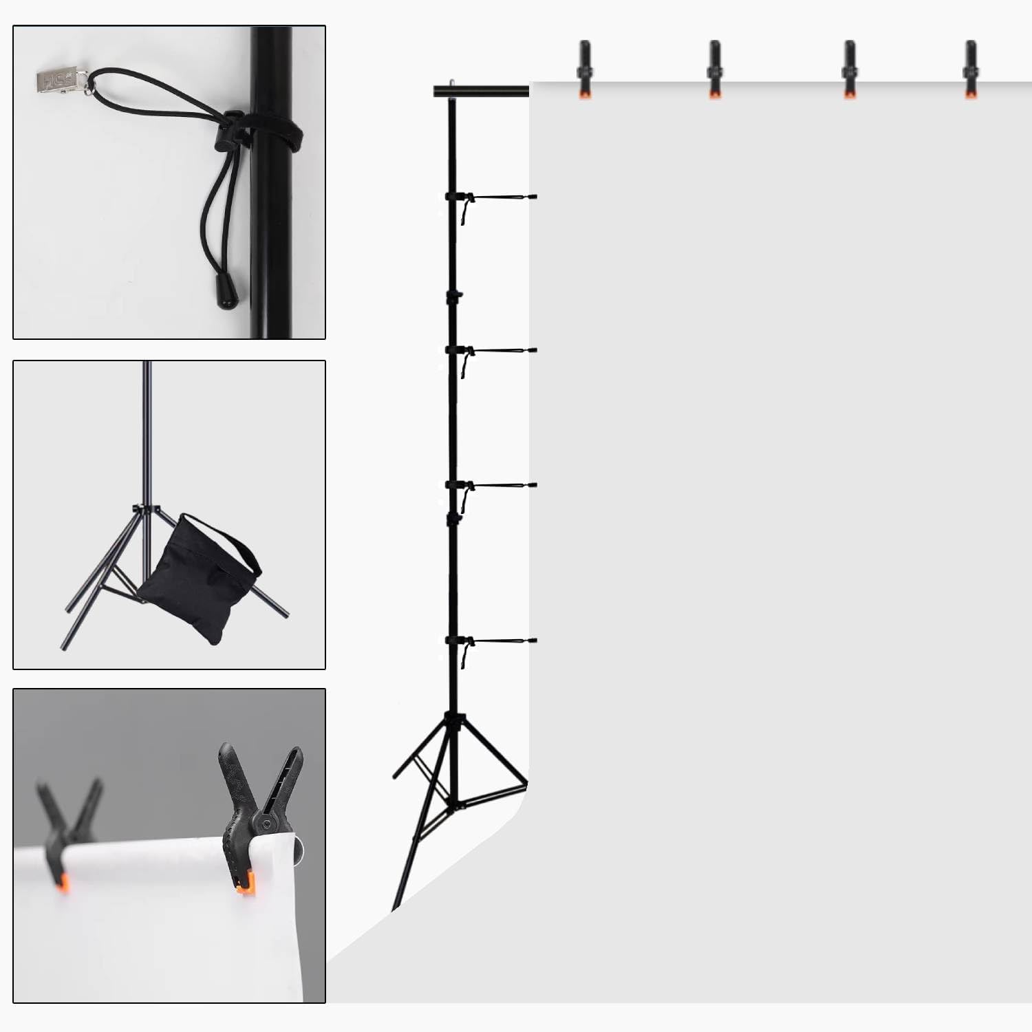 • 【Use with Accessories】 Use background clamps to secure the background to the background stand. Then use 8 spring clips to fix the background at even intervals to keep the background wrinkle-free. Two nylon sandbags are included to add stability to the background stand.
