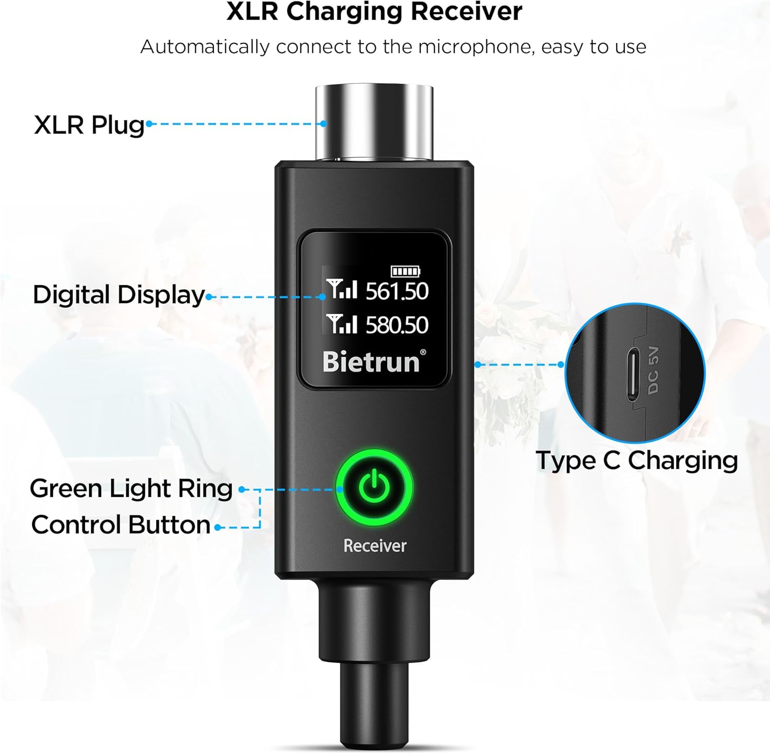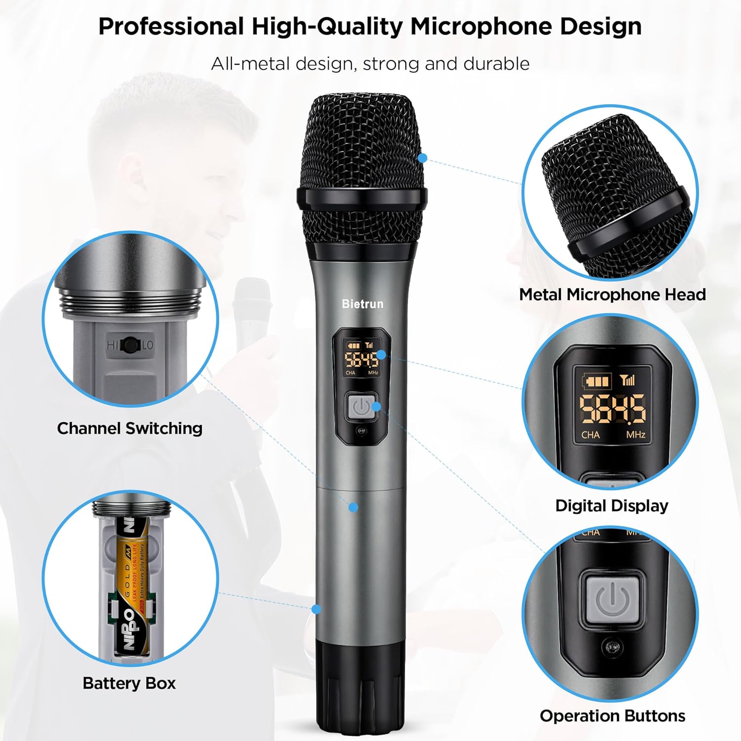 • BATTERY AND DISPLAY: ●The chargeable receiver is built-in 1200mAh battery for 7 hours use time when fully charged in 4-5 hours. The microphone does not come with any batteries, we recommend using 2 AA Amazon alkaline batteries. ●The display can show the battery power and signal strength in real time, don't worry about Suddenly not working.
