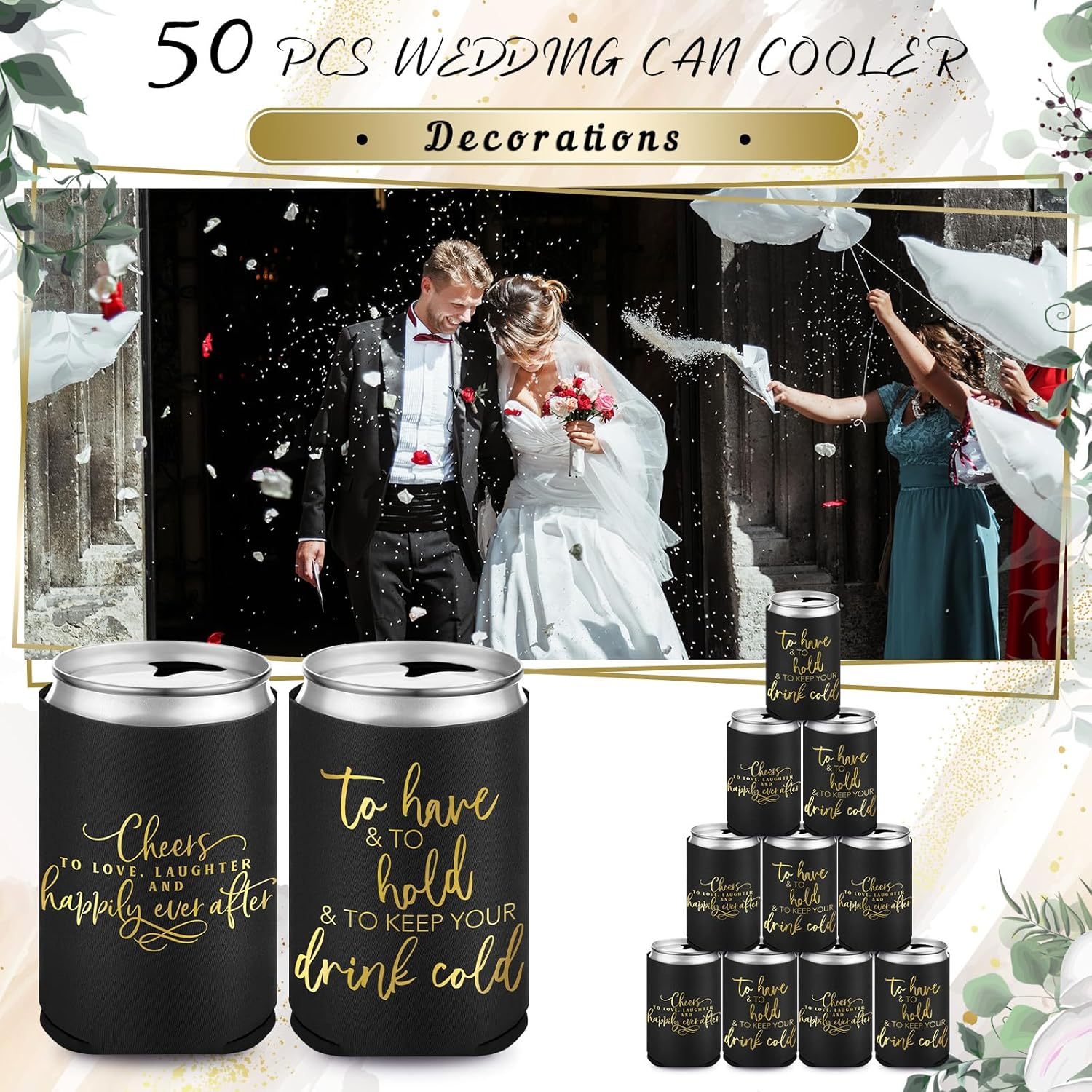 • Satisfying Party Package: our huge package containing 50 pieces of wedding can cooler decorations; Make every drink a celebration with our black and gold can coolers; They are suited to uplift the atmosphere at weddings, bridal showers, and bachelorette parties