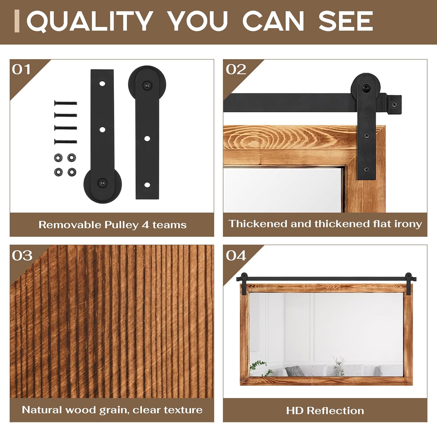 • QUALITY MATERIALS: The frame of the barn door mirror consists of an antique solid wood frame and a sturdy metal bracket. The interior features a 4mm HD silver mirror with clear and distortion-free reflections, providing a better sense of light and projection in your space