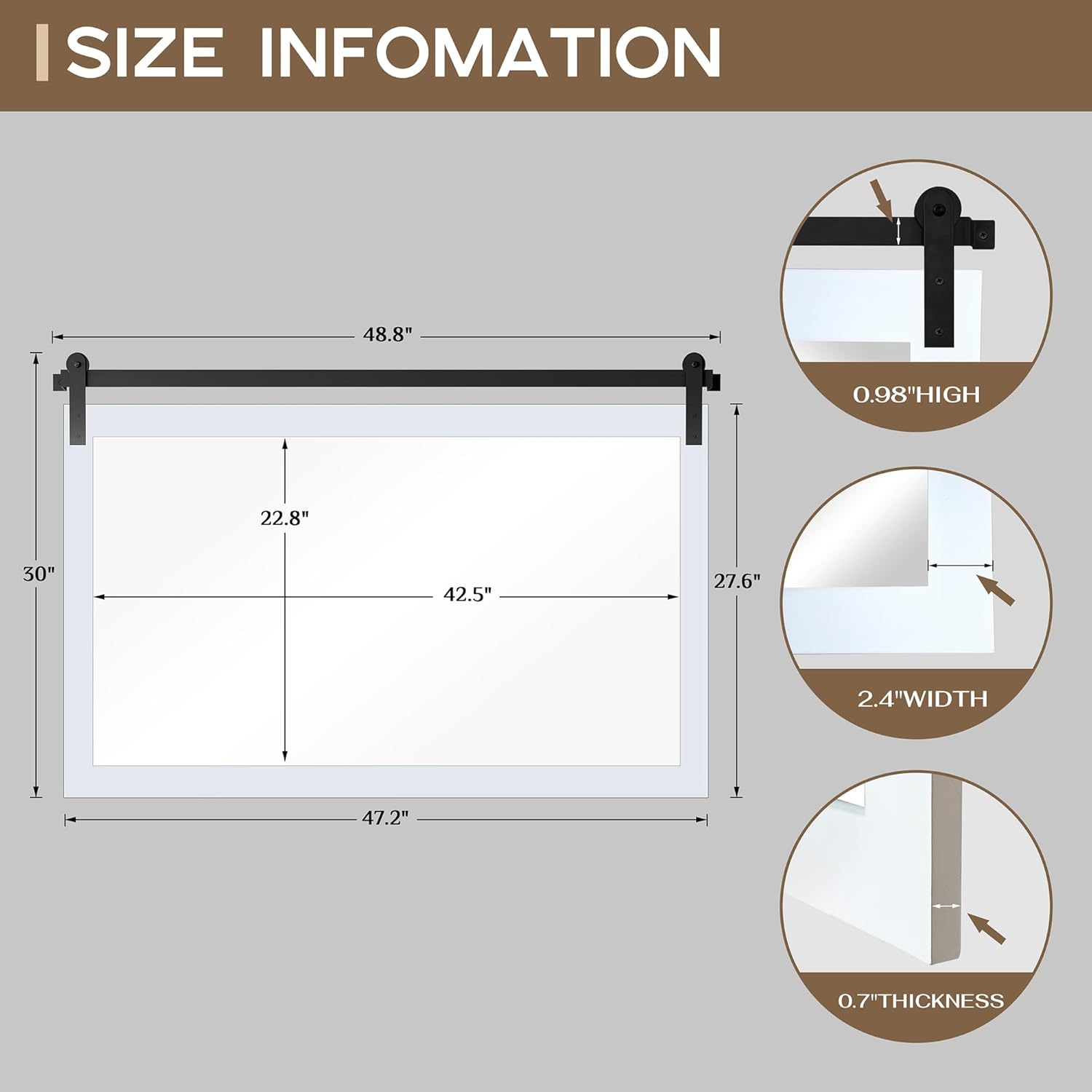 • EASY TO INSTALL: The overall size of this rustic mirror is 48.8 x 29.9 x 0.7 inch, and the display size of the mirror is 42.5 x 22.8 inch. The track is 49 inch. You can first fix the iron bracket on the mirror, then install the track on the wall, and finally the wheels on the iron bracket will be stuck into the track to complete the hanging