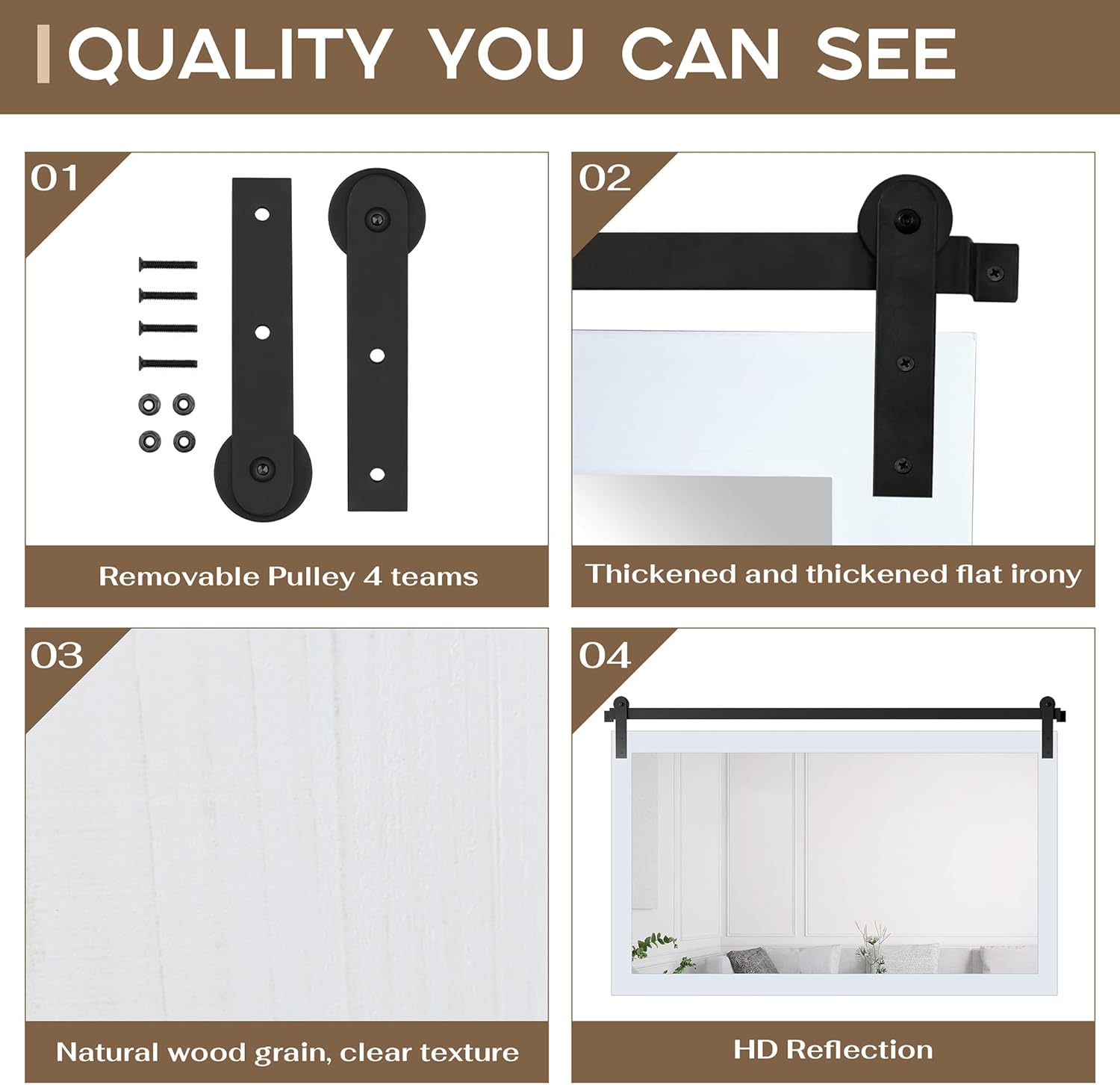 • QUALITY MATERIALS: The frame of the barn door mirror consists of an antique solid wood frame and a sturdy metal bracket. The interior features a 4mm HD silver mirror with clear and distortion-free reflections, providing a better sense of light and projection in your space