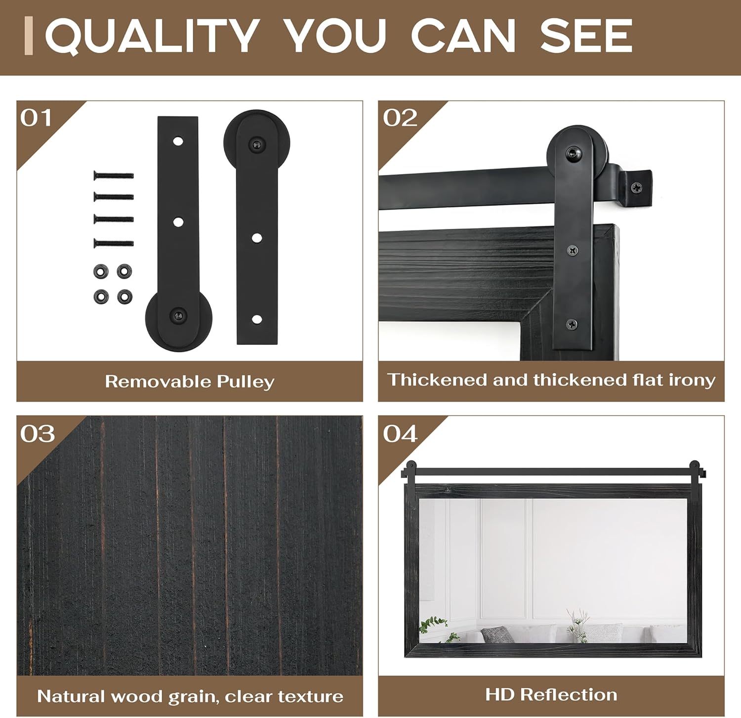 • QUALITY MATERIALS: The frame of the barn door mirror consists of an antique solid wood frame and a sturdy metal bracket. The interior features a 4mm HD silver mirror with clear and distortion-free reflections, providing a better sense of light and projection in your space