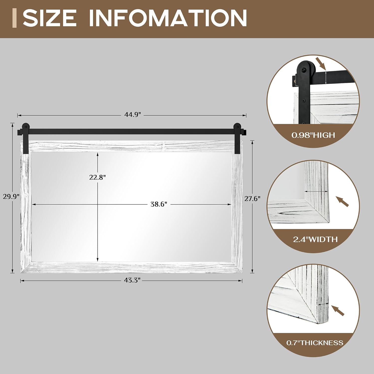 • EASY TO INSTALL: The overall size of this rustic mirror is 44.9 x 29.9 x 0.7 inch, and the display size of the mirror is 38.6 x 22.8 inch. The track is 45 inch. You can first fix the iron bracket on the mirror, then install the track on the wall, and finally the wheels on the iron bracket will be stuck into the track to complete the hanging