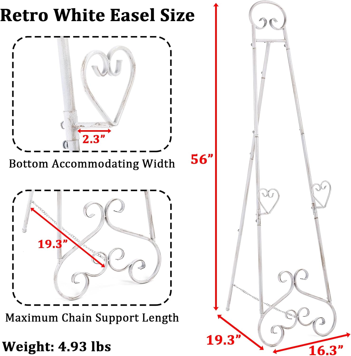 Extra Large Free Standing Adjustable Display Stand Easel with Chain Support, Retro White Decorative Metal Foldable Floor Standing Easel for Display Mirror Wedding Welcome Signs, 16.3" x 19.3" x 56"