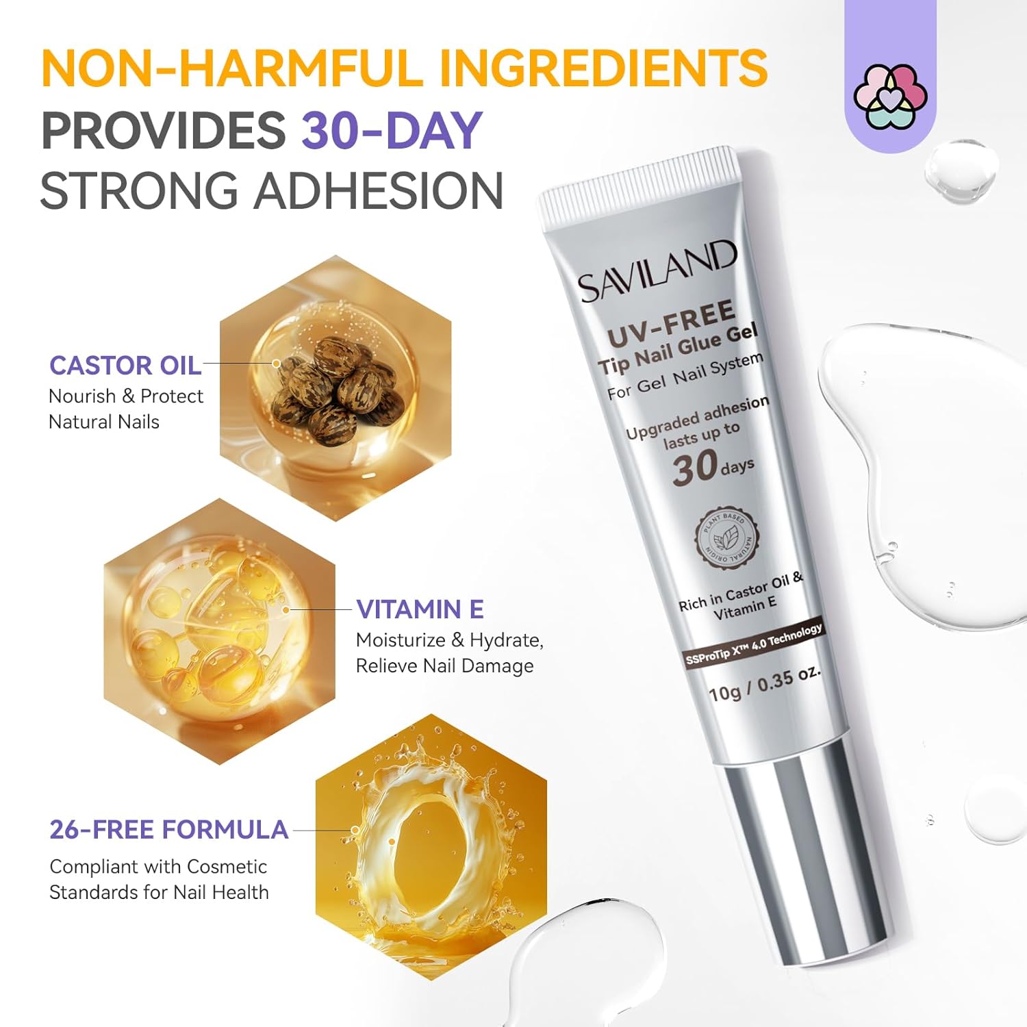 • 30-Day Ultra Long-Lasting: SAVILAND fake nail glue features a 26-free formula enriched with Castor Oil and Vitamin E. This formula not only provides a strong, long-lasting bond for up to 30 days but also helps nourish nails, preventing breakage, brittleness, dryness, curling, peeling, and splitting. A must-have for your manicure kit or cosmetics bag