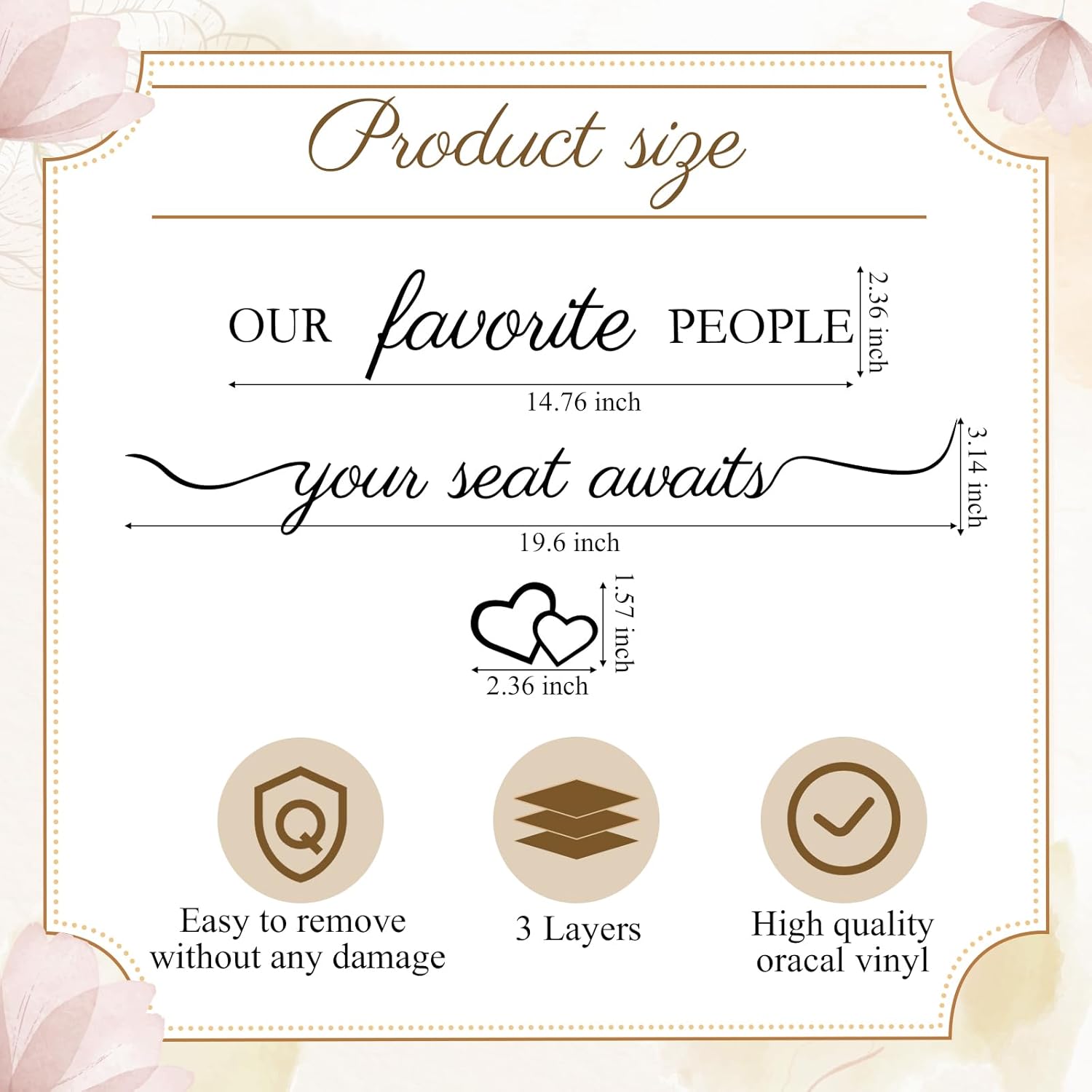 • Ideally Sized for Convenience: these wedding seating chart stickers boast 3 components; 'Our favorite people' measuring about 14.76 x 2.63 inches, 'Your Seat Awaits' sizing to about 19.69 x 2.72 inches, and a charming 'heart' roughly 1.57 x 2.36 inches; These dimensions ensure the decal fits well onto various surfaces while ensuring visibility and attractiveness