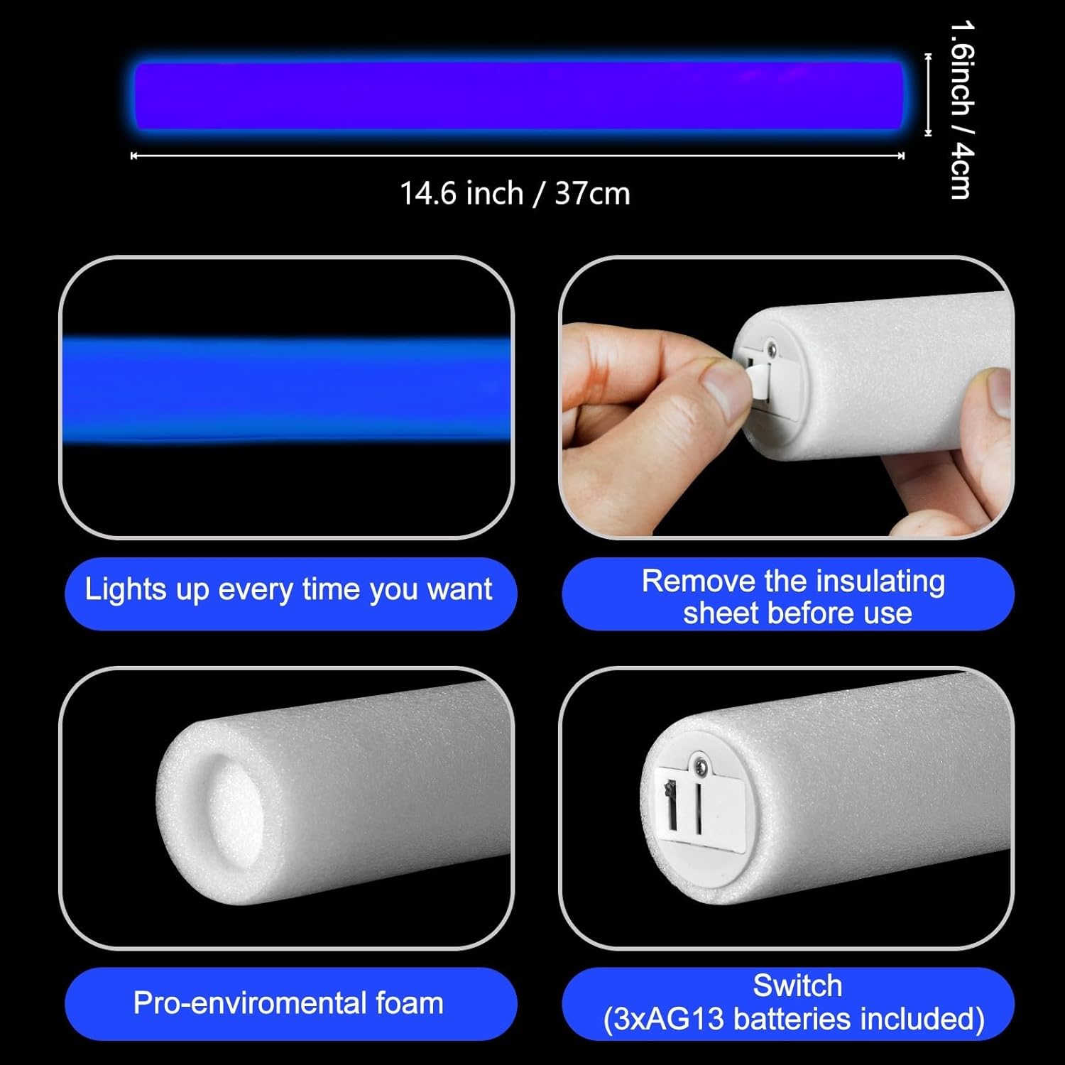• Glow In the Dark Giant Foam Sticks: You will get 24 pack blue light up foam glow sticks. Press the power button to switch between the 3 different light up modes: quick flashing, slow flashing and alternately flashing. These LED foam sticks boast vibrant colors, offering wider light coverage and ensuring the excitement party experience,bring tons of joy for you and your families. Perfect for theme music festivals, birthday, camping, clubs, shows, goodie bag or stocking stuffer and more