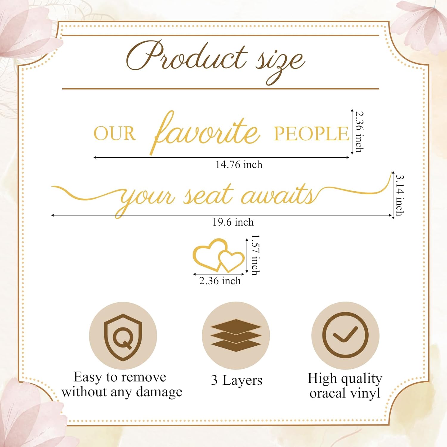 • Ideally Sized for Convenience: these wedding seating chart stickers boast 3 components; 'Our favorite people' measuring about 14.76 x 2.63 inches, 'Your Seat Awaits' sizing to about 19.69 x 2.72 inches, and a charming 'heart' roughly 1.57 x 2.36 inches; These dimensions ensure the decal fits well onto various surfaces while ensuring visibility and attractiveness