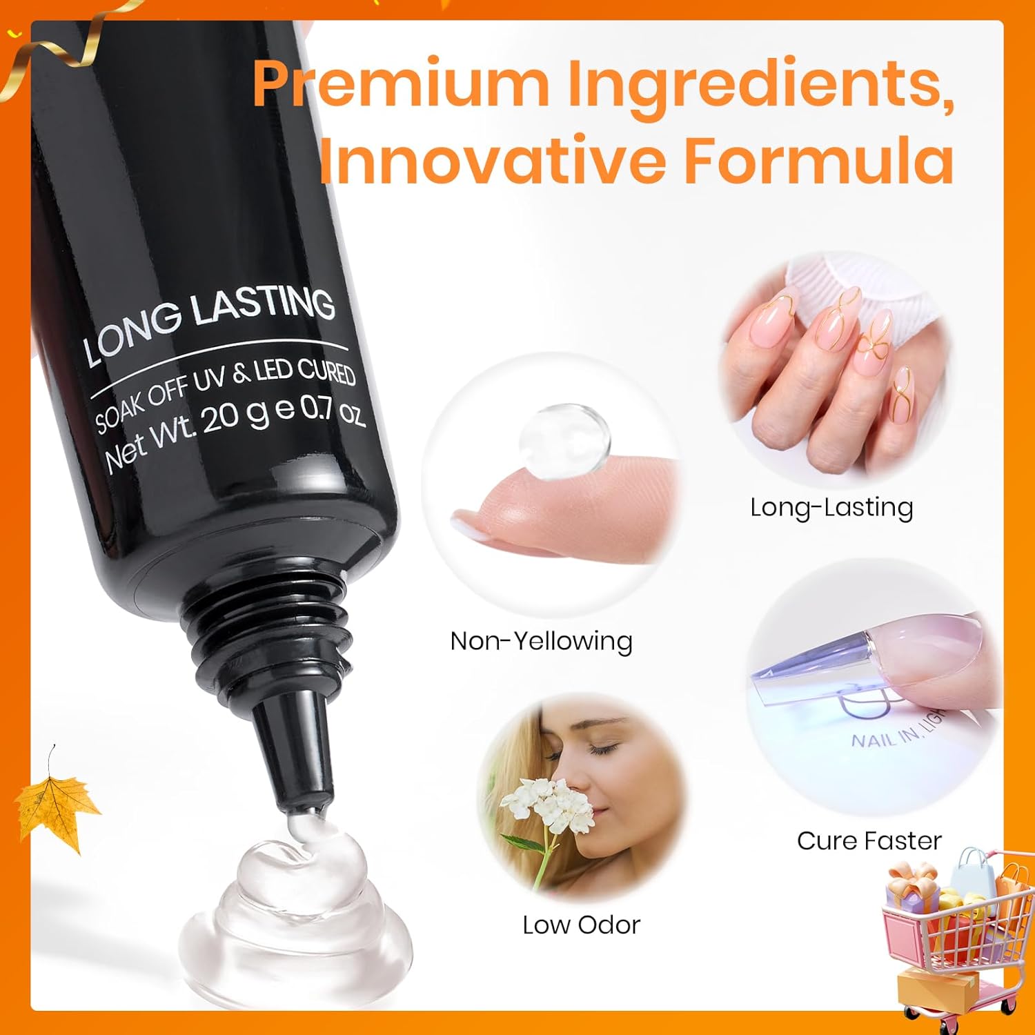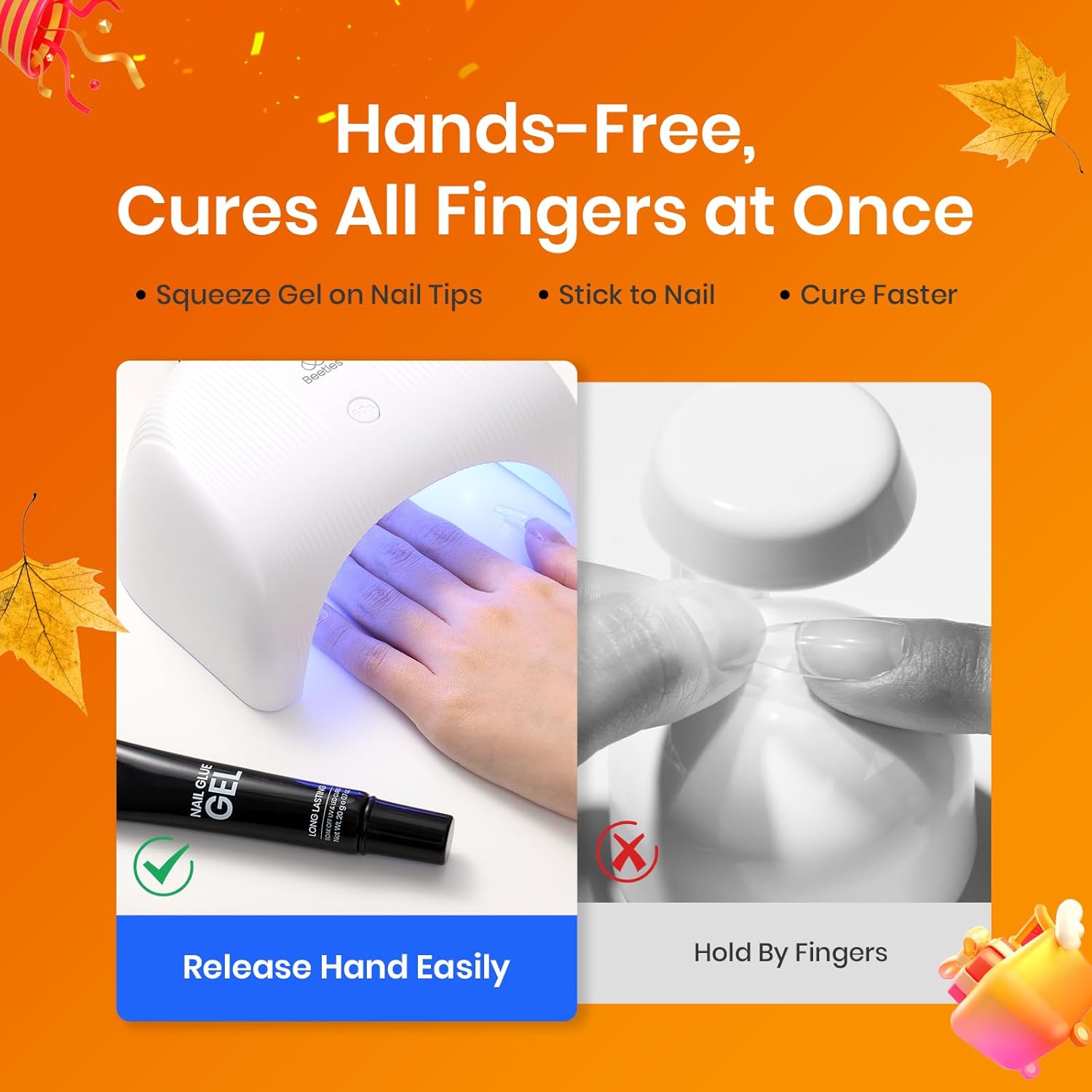 • Efficient &Convenient: Nail Glue Gel boasts a convenient hands-free design, enabling both manicurist and enthusiasts to apply nail tips without needing to hold them in place during the UV curing process. You can apply all five fingers at once and cure them together, effortlessly saving you up to five times the usual nail art time. Beetles Fall Nail Fest