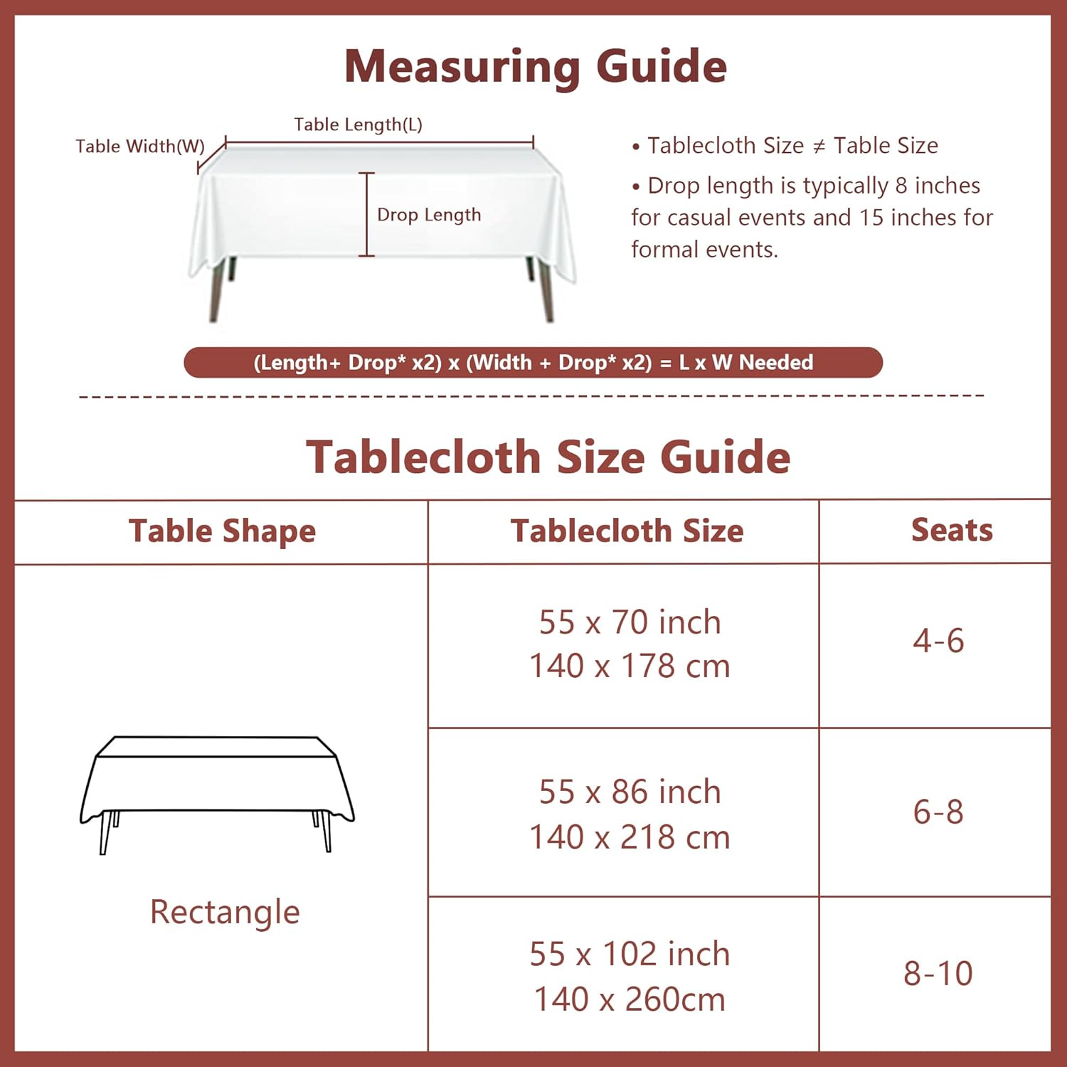 • Dimensions: Tablecloth size 55x86" fit for 6-8 seats. Measure the size of the table, it is recommended to increase the table length by more than 20 inches (10 inches on one side) to get a better drop effect. Sold in piece (1pc ablecloth in each package).