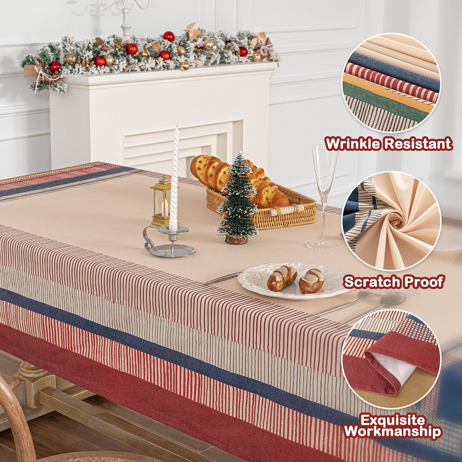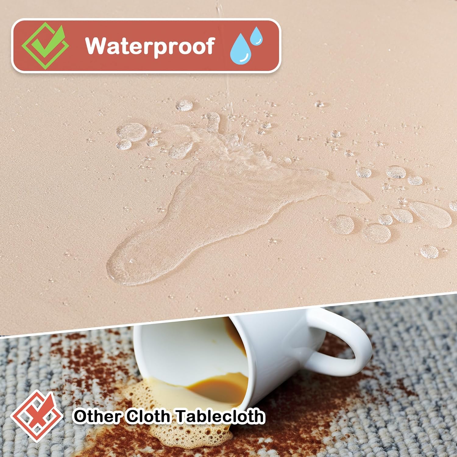 • Water Resitant: Our tablecloths are treated with an extra waterproof coating that not only makes them anti-splash and water-resistant. (Warm Tips: Water Resistant, Spills should be removed immediately)