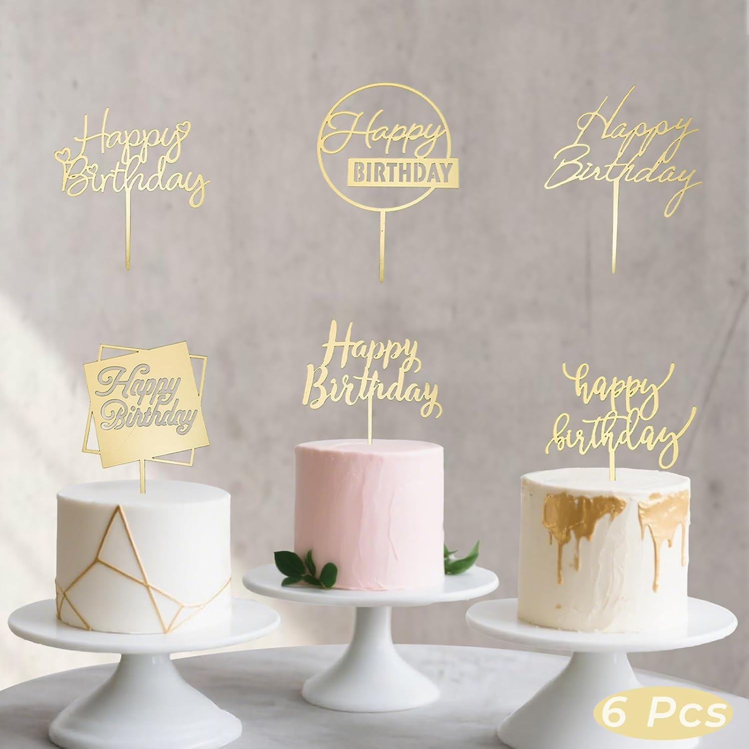 6-Pack Acrylic Birthday Cake Toppers, Minimalist Gold Happy Birthday Sign for Cake Decorations