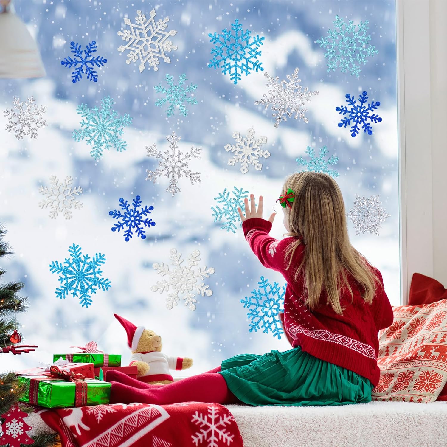 • Super Value Set: This winter decorations pack includes 50pcs intricately designed glitter snowflake cutouts in blue silver and white. With 250 adhesive points included, it's easy to add a flurry of snowflakes to any area, creating a winter wonderland atmosphere that’s perfect for holiday gatherings and parties