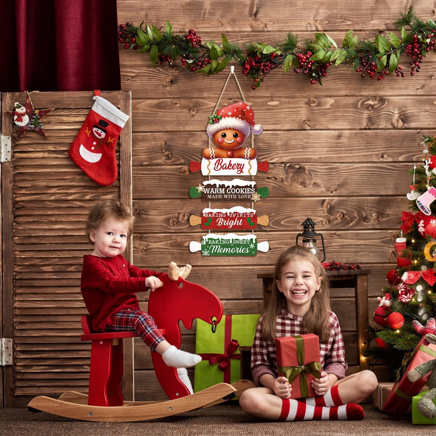 CHDITB Wooden Gingerbread Bakery Christmas Door Hanger, Rustic Christmas Wall Hanging Sign with Cookies Rolling Pin Warm Saying, Farmhouse Xmas Winter Holiday Decor for Indoor Outdoor