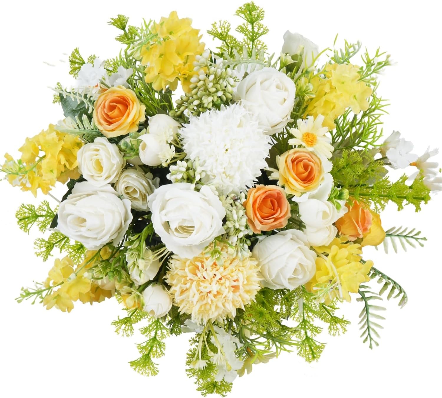 • [Multiple collocation]:Faux flower bouquet showcases a harmonious blend of chrysanthemums, delicate roses, vibrant daisies, and graceful yellow hyacinths.