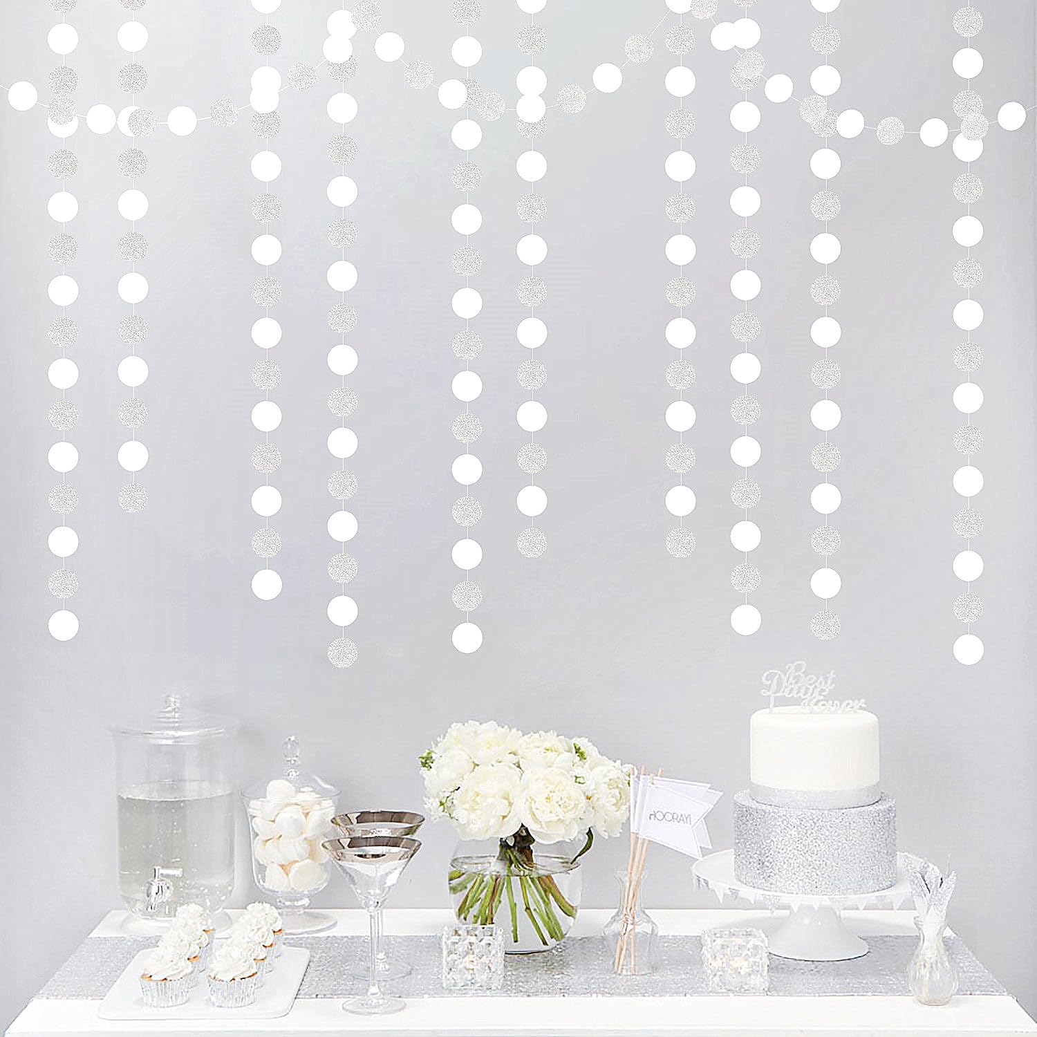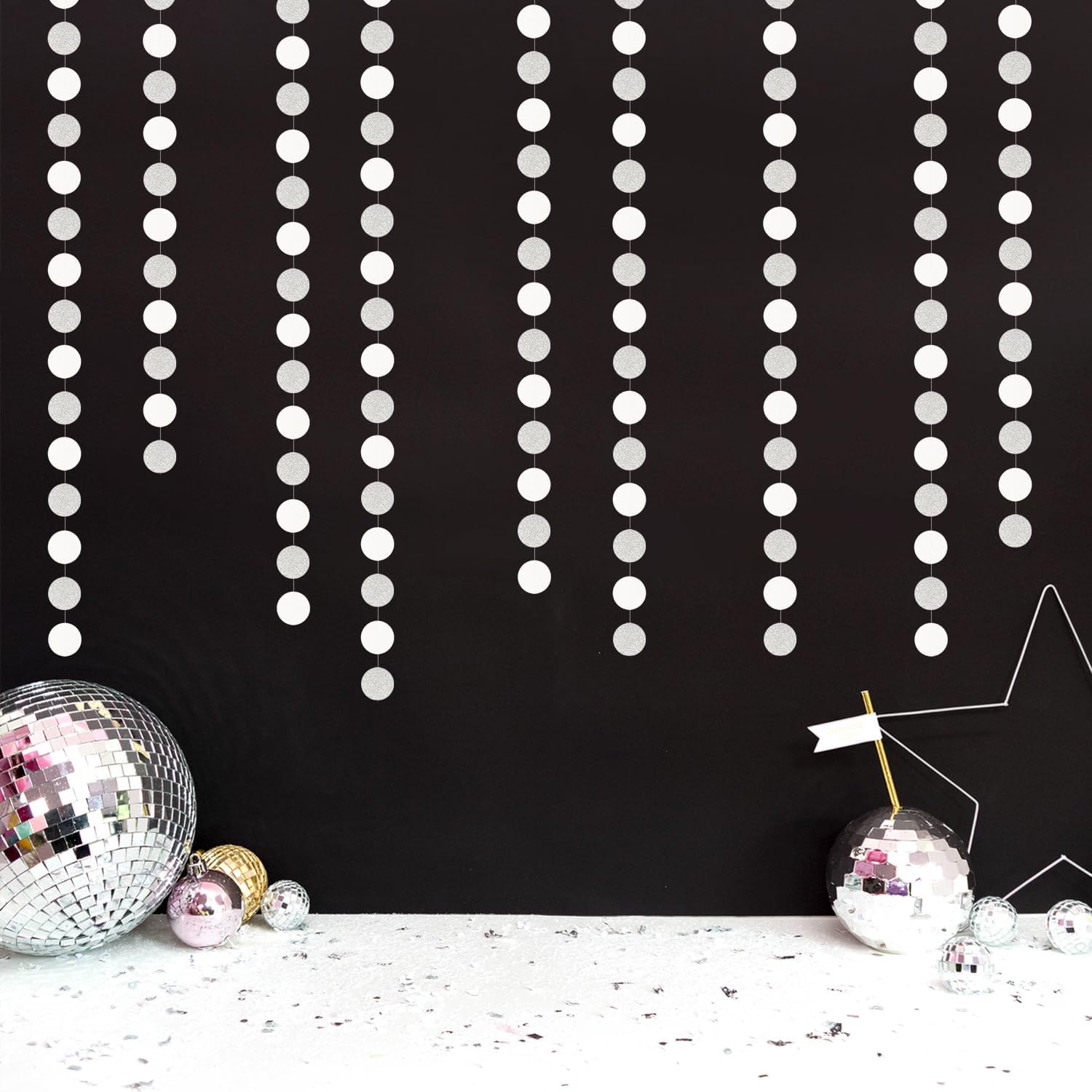 • PACKAGE CONTAINS: This set has four glitter silver white circle paper garland,the length of each strand is 4 meters/13 feet, the total length is 16 meters/52 feet.The size is 2IN.