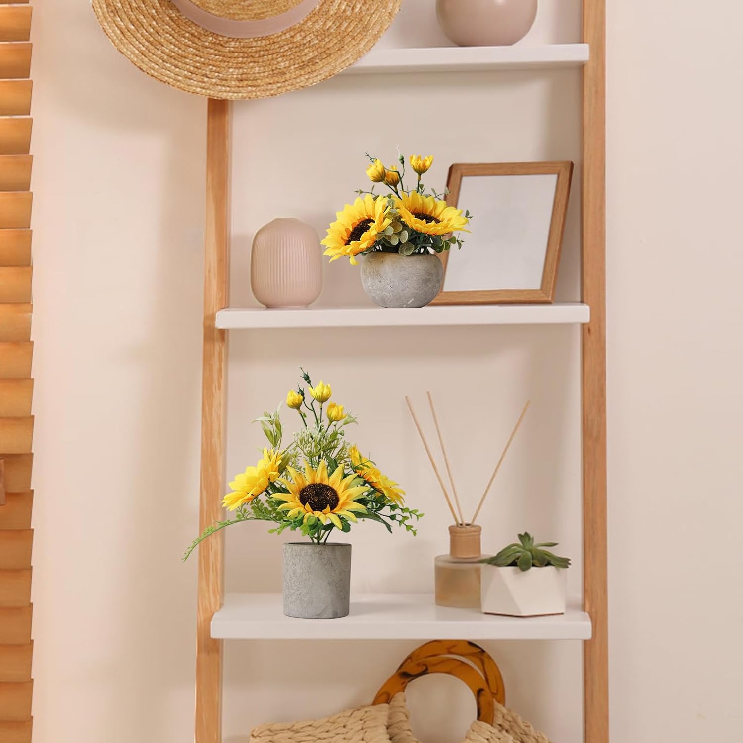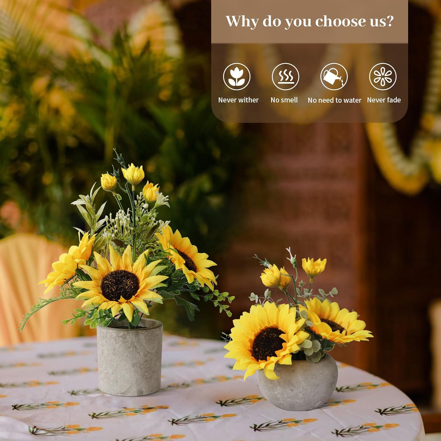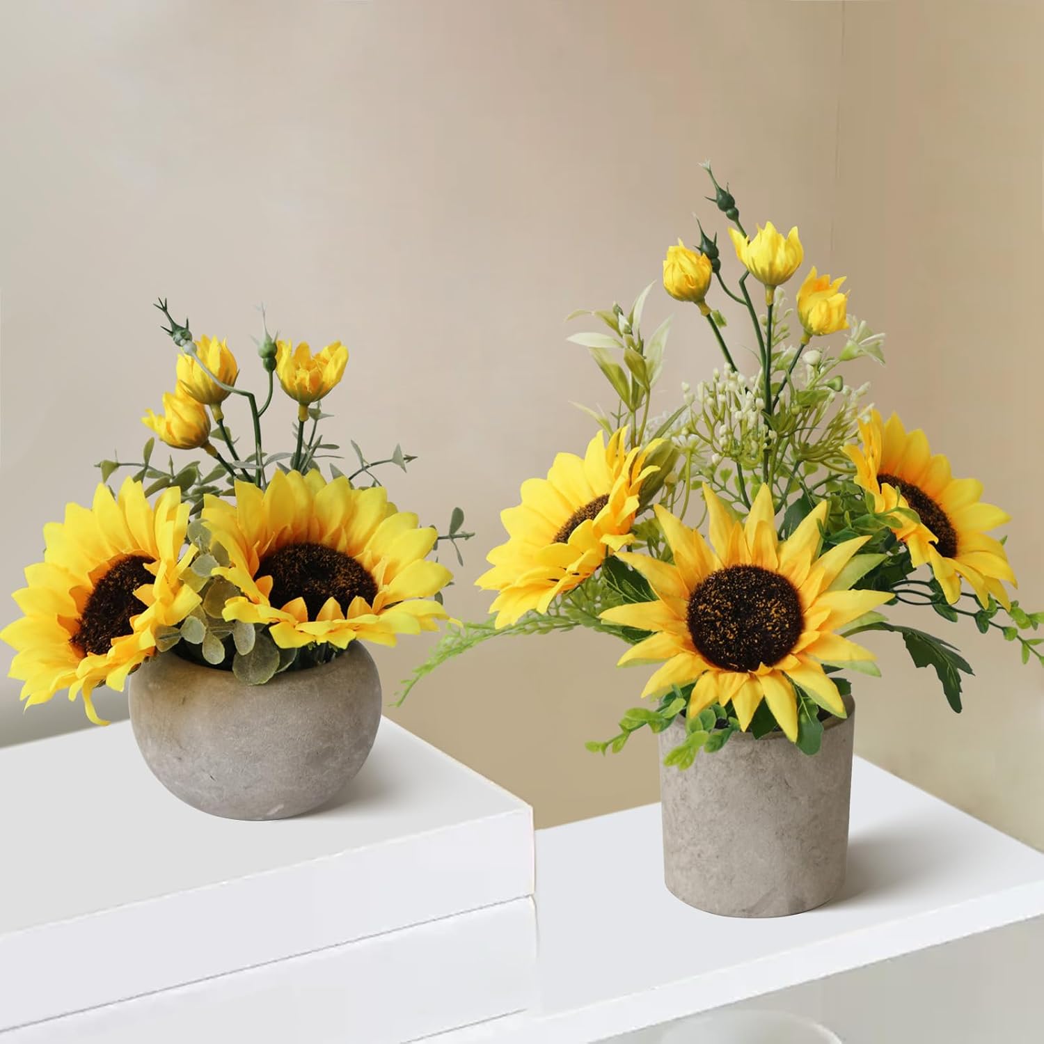 • Package:2 Pcs Sunflowers artificial flowers pot set includes 5 pcs fake flowers,Some small flowers,Plants and eucalyptus for sunflower kitchen decor;sunflower bathroom decor;summer decorations for home;yellow decor