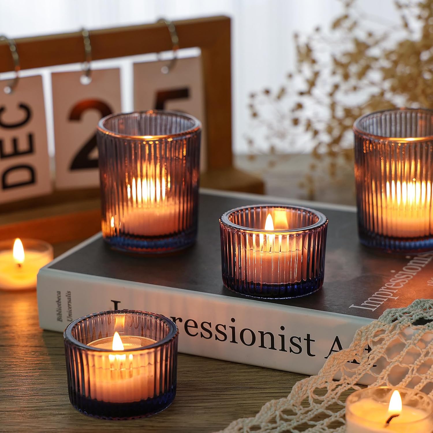 • Votive Candle Holders:These ribbed votive candle holders boast a sleek, vintage design. The blue glass construction allows the candlelight to cast a beautiful, enchanting glow. Perfect for any setting, whether placed on a table, mantelpiece, bedside, or used as a decorative accent in any living space.