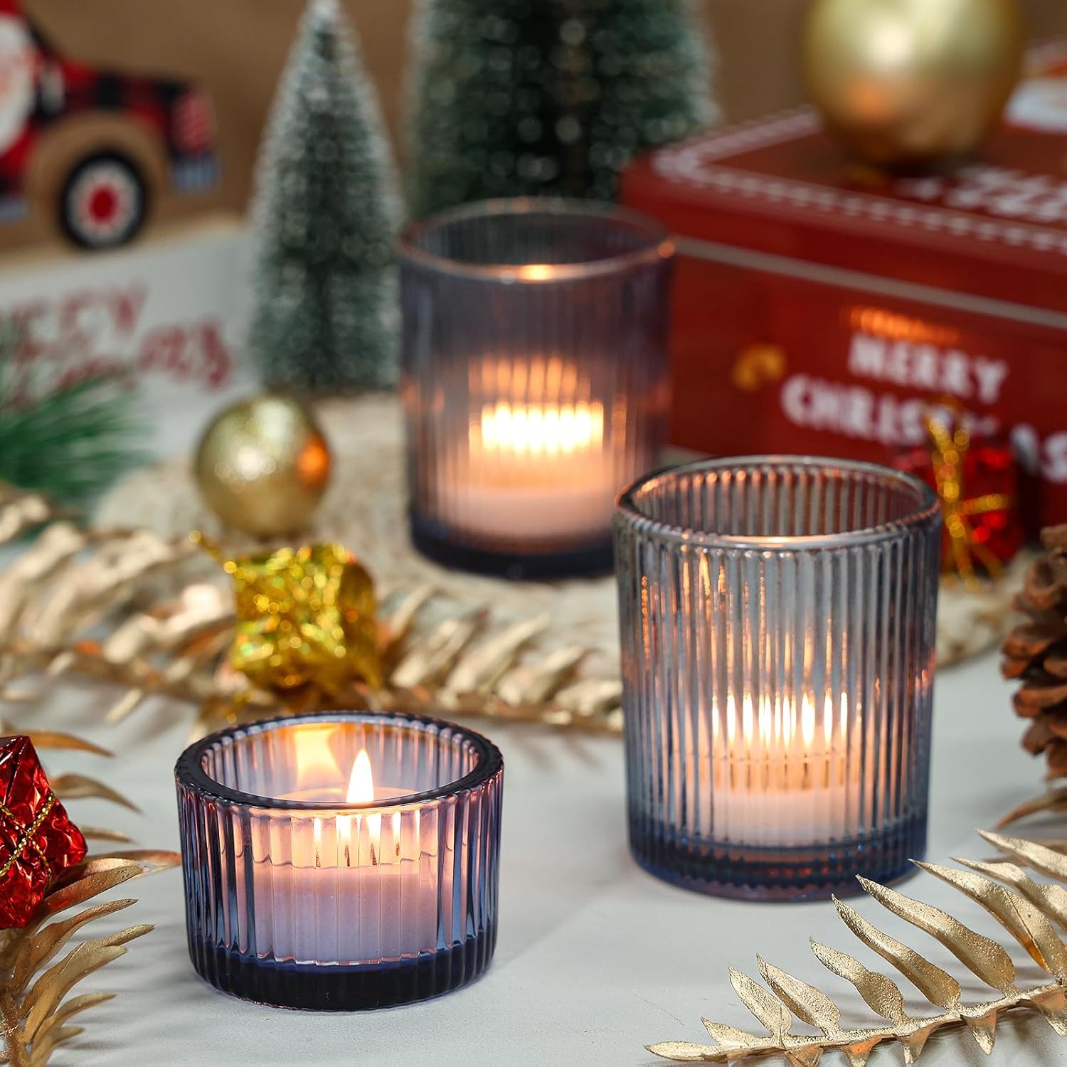 24 Pcs Ribbed Votive Candle Holders, Dark Blue Glass Holders Bulk for Table Centerpiece, Tealight Holders Glass for Wedding Shower, Party and Home Decor