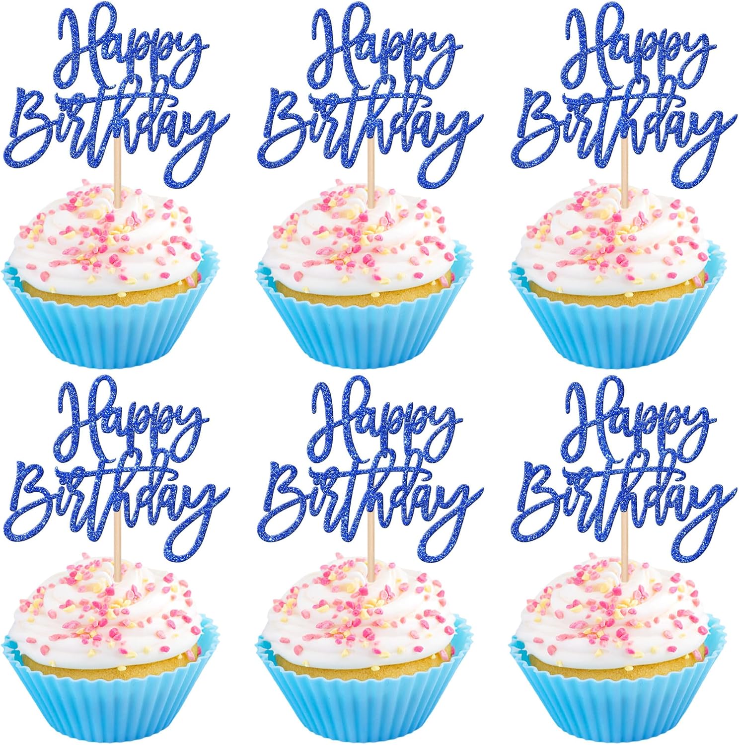 24 PCS Happy Birthday Cupcake Toppers Glitter Picks for Celebrating Anniversary Theme Party Cake Decorations Supplies Dark Blue