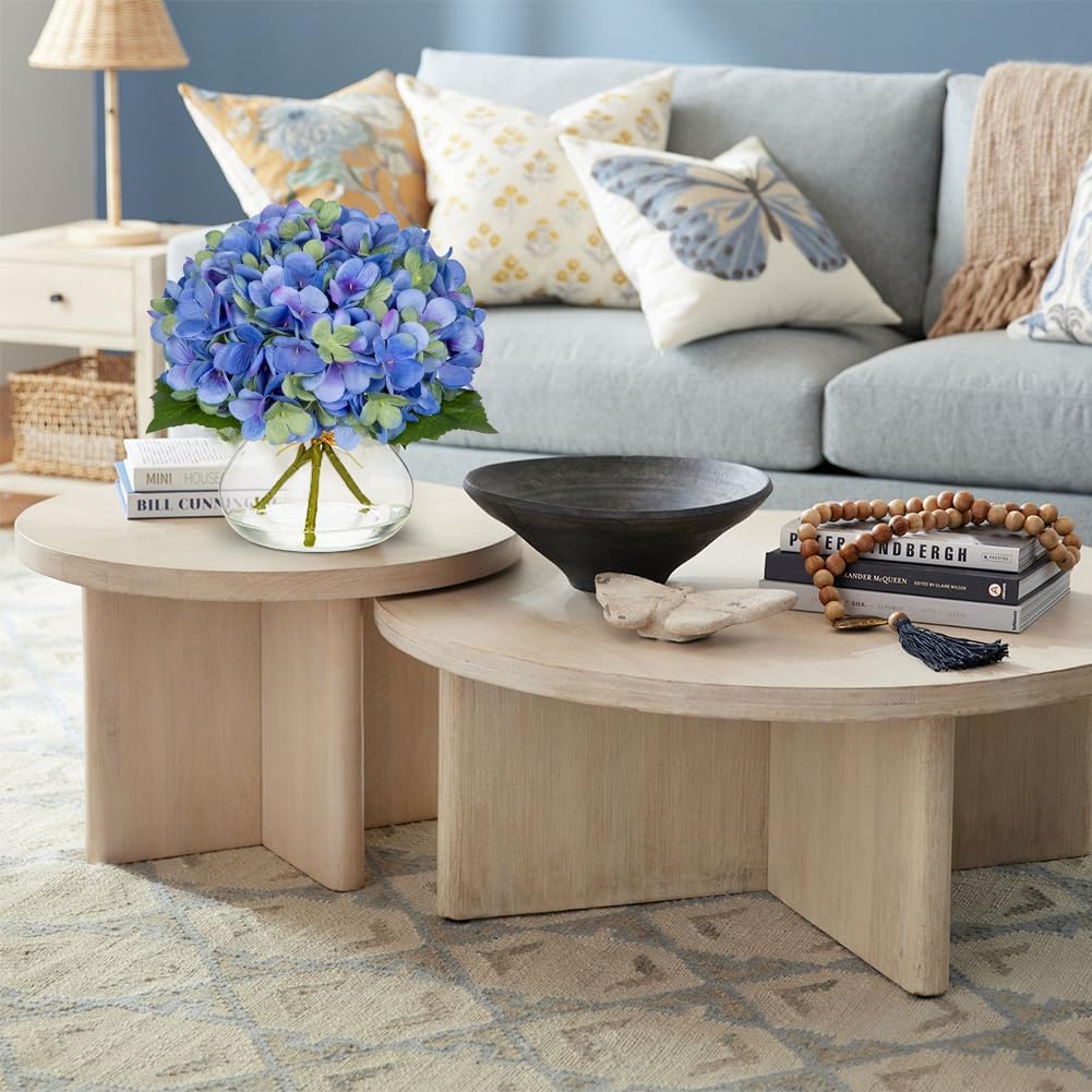 Hollyone Hydrangea Artificial Flowers with Glass Vase Blue-Green Silk Faux Flowers Arrangements in Vase with Faux Water Fake Floral Bulk Bouquet for Home Decor Table Centerpiece Decorations