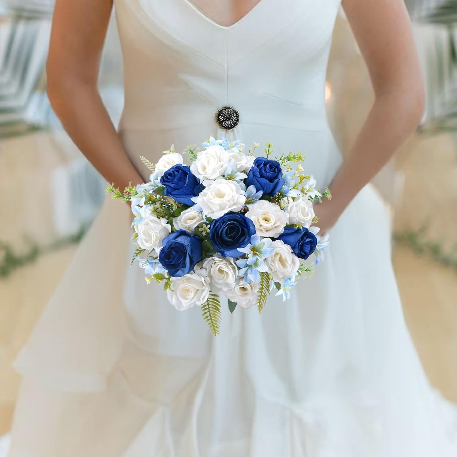 • [Multiple collocation]:Faux flower bouquet showcases a harmonious blend of delicate white roses and elegant blue roses. You can use these artificial flowers to make bridal bouquets,boutonnieres,wedding centerpieces and more.