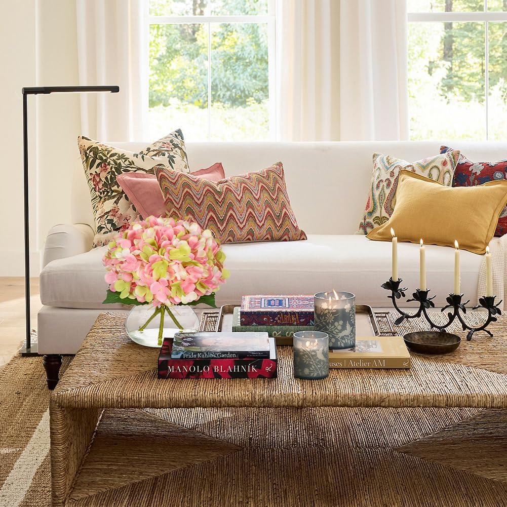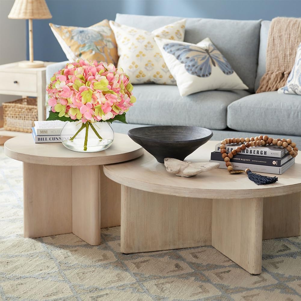 Hollyone Hydrangea Artificial Flowers with Glass Vase Pink-Green Silk Faux Flowers Arrangements in Vase with Faux Water Fake Floral Bulk Bouquet for Home Decor Table Centerpiece Decorations