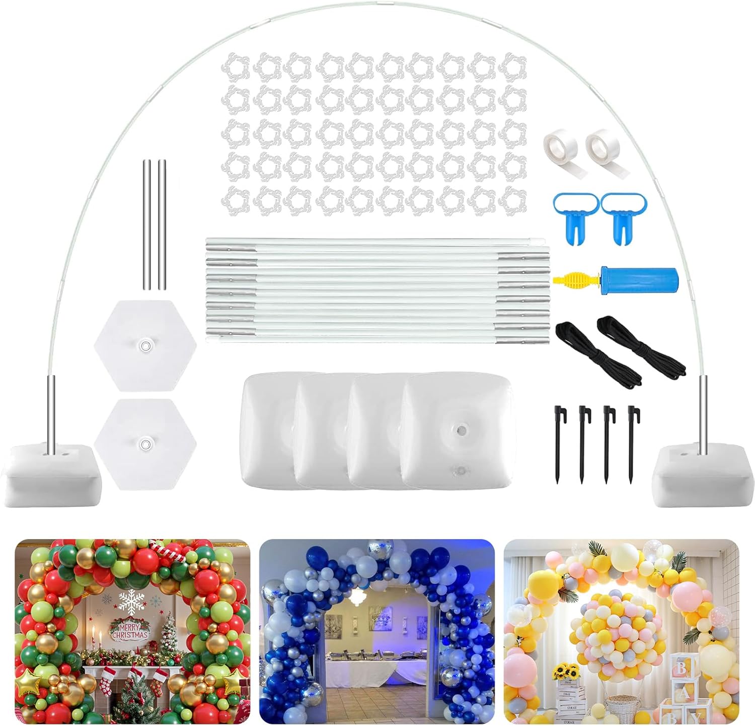 • Balloon Arch Stand Kit Includes: The balloon arch kit package includes 2 x pvc Hexagonal bases, 4 x Water (sand) fillable bag, 15 x folded carbon fiber balloon poles (each 42cm), 2 x 30cm fixed poles, 50 x Balloon clips, 2 x 3-meter fixing ropes, 4 x ground nails, 2 x 1 balloon tape (200 dispensing Points), 2 x balloon knotter, 1 x manual balloon pump. The complete set allows you to make balloon arch decorations in one stop.