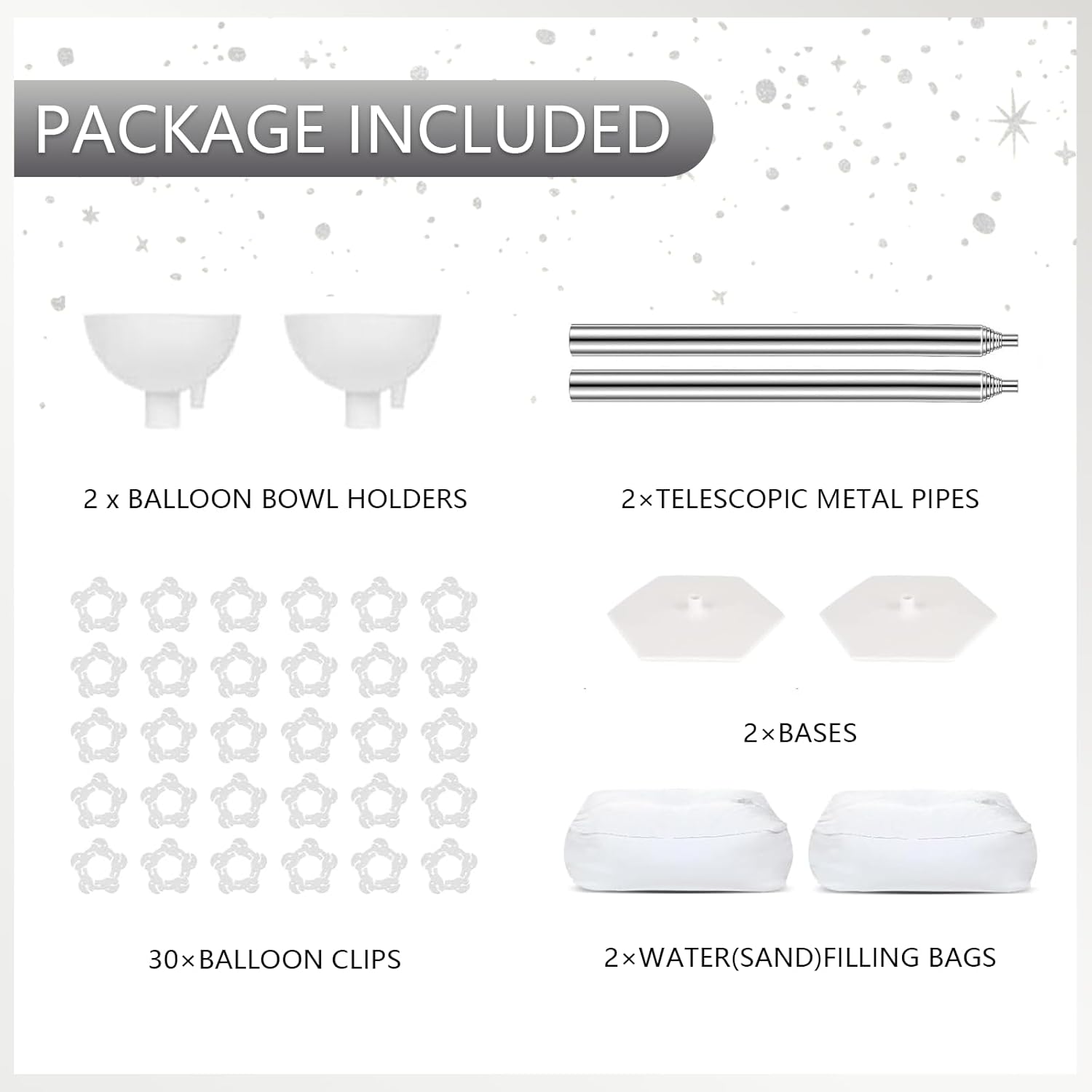 • Balloon Column Kit Includes: The balloon arch package includes 2 x metal telescopic pipes, 2x Hexagonal bases, 2 x Water (sand) fillable bag, 2 x balloon bowl holders, 30 x Balloon clips. Elevate your party decoration with our balloon column stand kit—perfect for weddings, birthdays, graduations, and any special occasion. This kit is a must-have for anyone looking to make their event unforgettable!